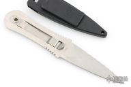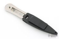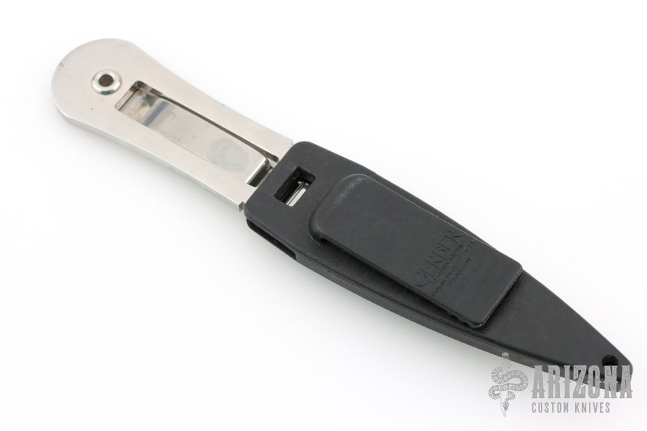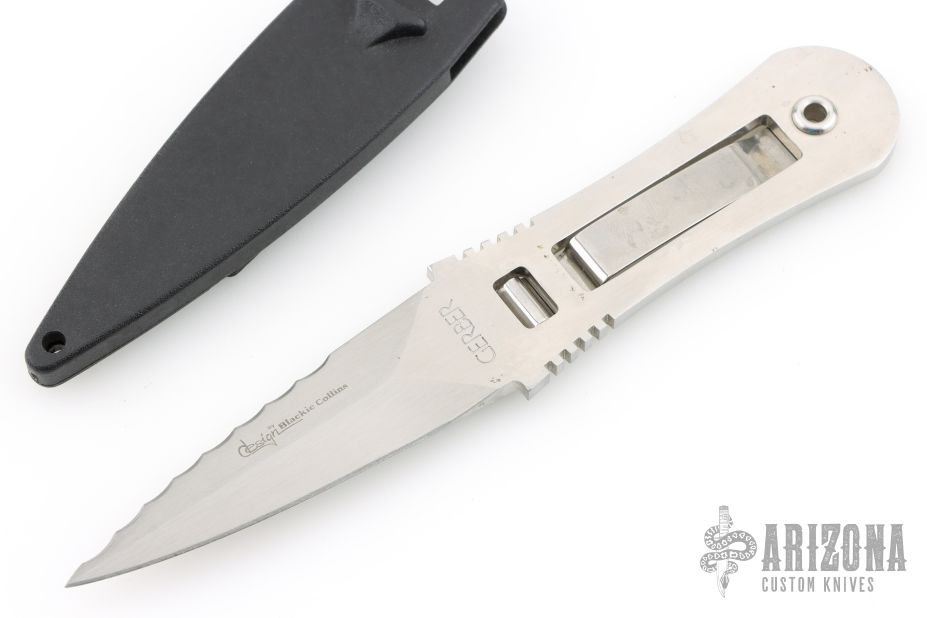 This boot knife by Gerber is a Blackie Collins design, it features a satin finished blade with one plain edge and one serrated edge, .168" blade stock and 1.083" blade depth, full tang construction. The handle has a clip that holds it in the sheath. Comes with black plastic sheath. Has a few light scratches, otherwise excellent condition.