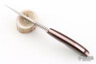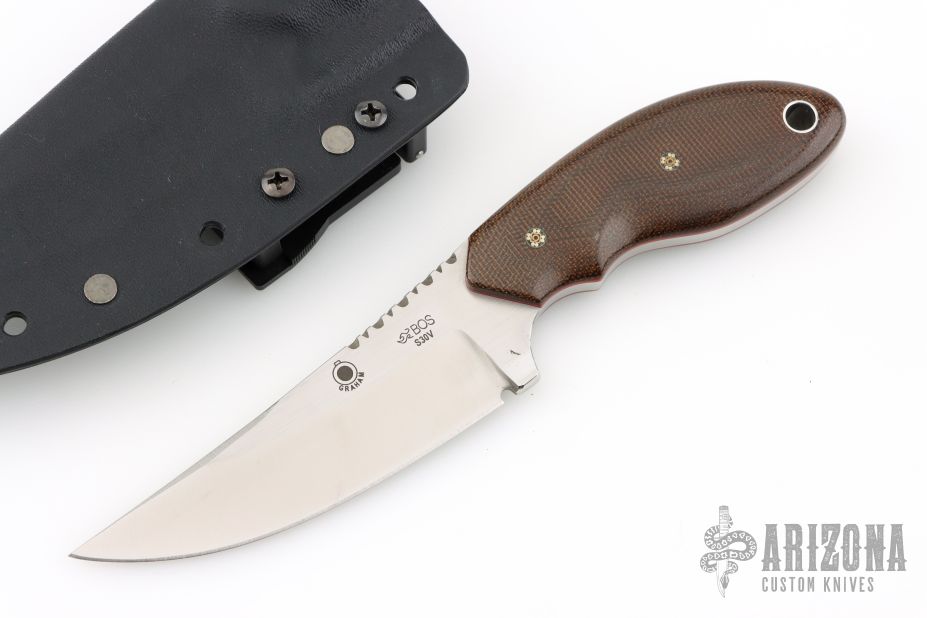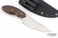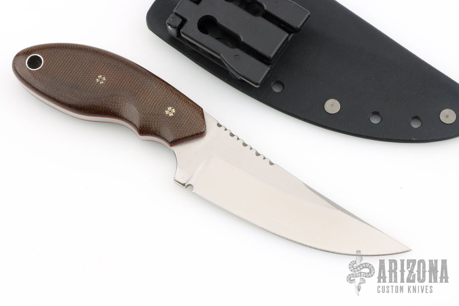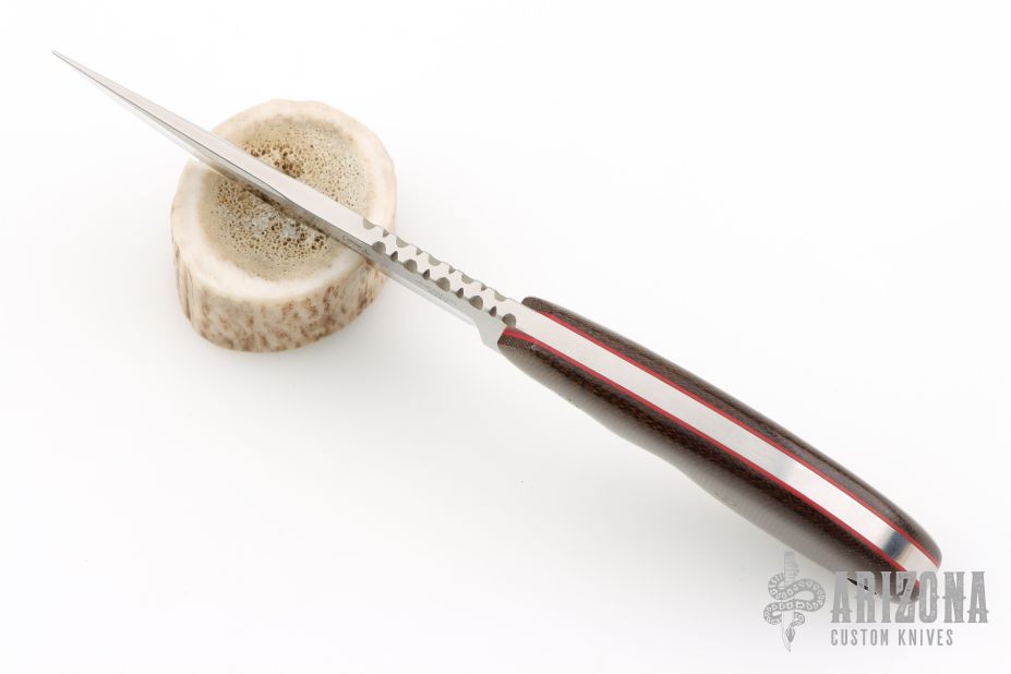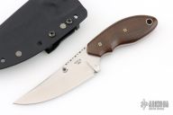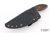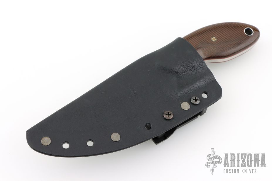 This HUT-1 Tactical Fixed Blade from Graham Knives features a trailing point satin finish blade with swedge and fileworked thumbrest, .182" blade stock and 1.303" blade depth. The handle is comprised of micarta scales with mosaic pins over red liners and full tang construction. Lanyard tube in pommel. Includes Kydex sheath with teklok. Has a few light sheath scuffs/scratches. Excellent condition.