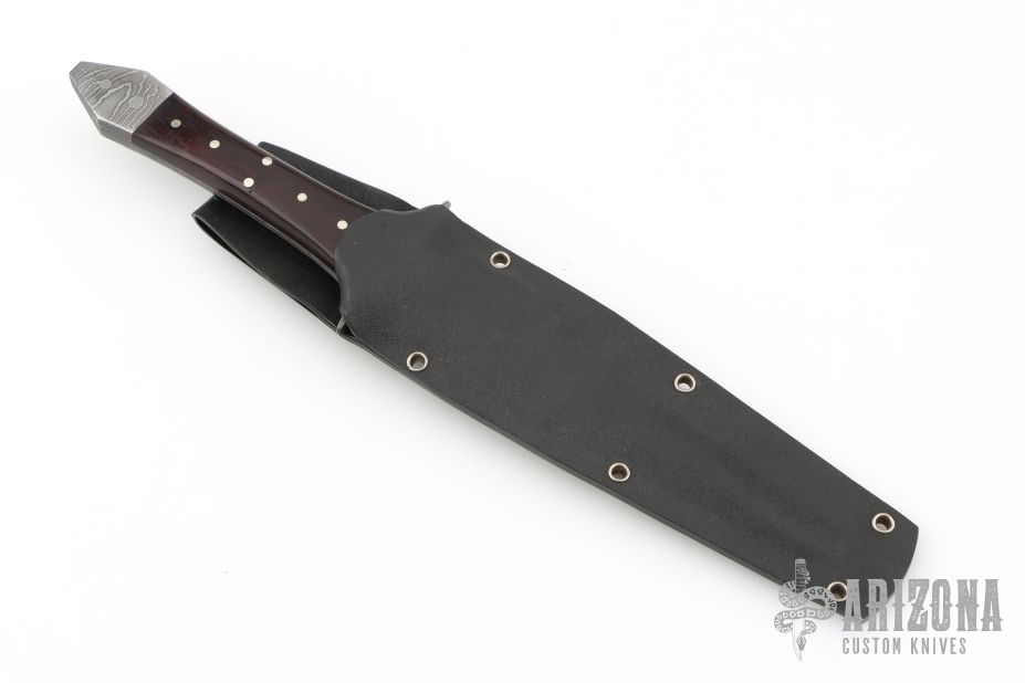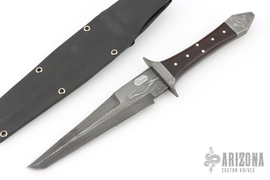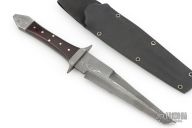 This fighter by Van Voorhees features a Damascus blade with sharpened top edge, .157" blade stock and 1.424" blade depth, full tang construction. The handle has Damascus guard and rear bolsters, dark wood scales with nickel silver pins. Comes with a kydex sheath. Has a couple light scuffs, otherwise excellent condition.