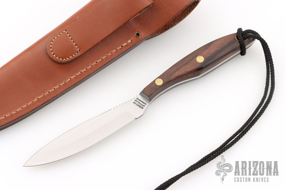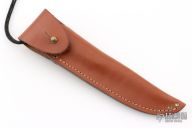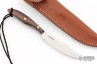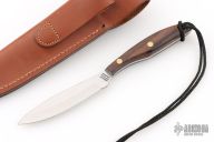 The belt Knife, by Grohmann Knives, features a polish finished upswept drop point blade with a notched thumb rest and a full tang construction. .098" Blade Stock .783" Blade Depth. The handle is composed of pinned wood scales. Includes a brown leather sheath. Has a couple light scratches, otherwise Excellent Condition.
