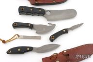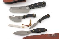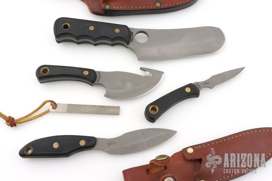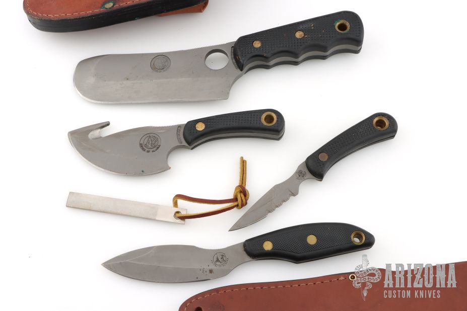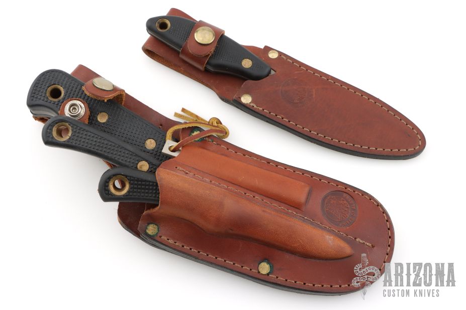This Triple Combo from Knives of Alaska features three knives. A bush cleaver, a gut hook skinner and a caper. All knives feature a bead blasted D2 steel blade with checkered rubber scales over full tang construction. Includes brown leather triple sheath with belt loop. Light scuffs and sheath marks on all blades, but overall great condition. Listing includes a matching Canada Belt Knife and leather sheath.