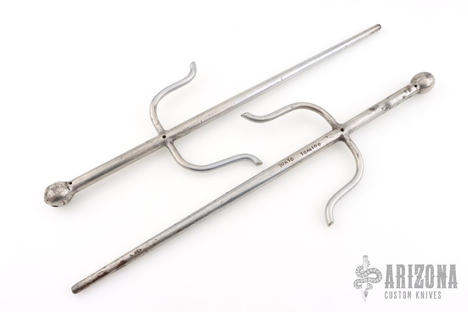 This set of Vintage Sais are made from satin finished steel and are integrally constructed. They have dings, scratches and some oxidation spots, otherwise good condition. They are roughly .550" thick at the widest point. The wrap has been removed.