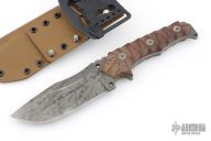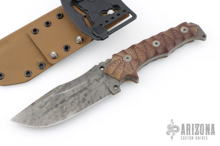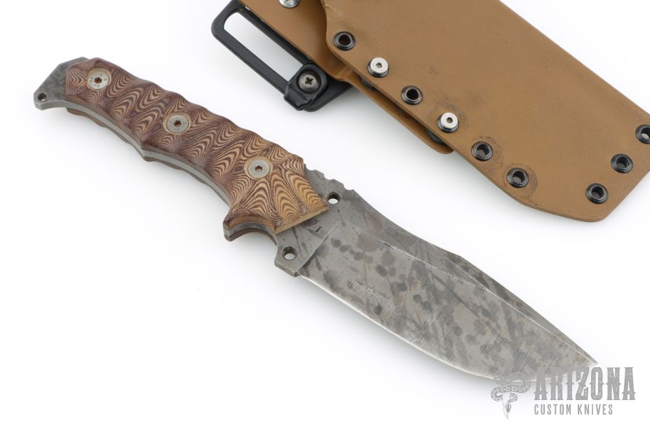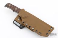 This Haast Eagle by Wander Tactical features an acid etch finished blade with false top edge and notched thumbrest, .222" blade stock and 1.825" blade depth, full tang construction. The handle has brown micarta scales, and lanyard hole. Comes with a kydex sheath with belt clip. Has a few light scratches, otherwise excellent condition.