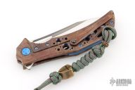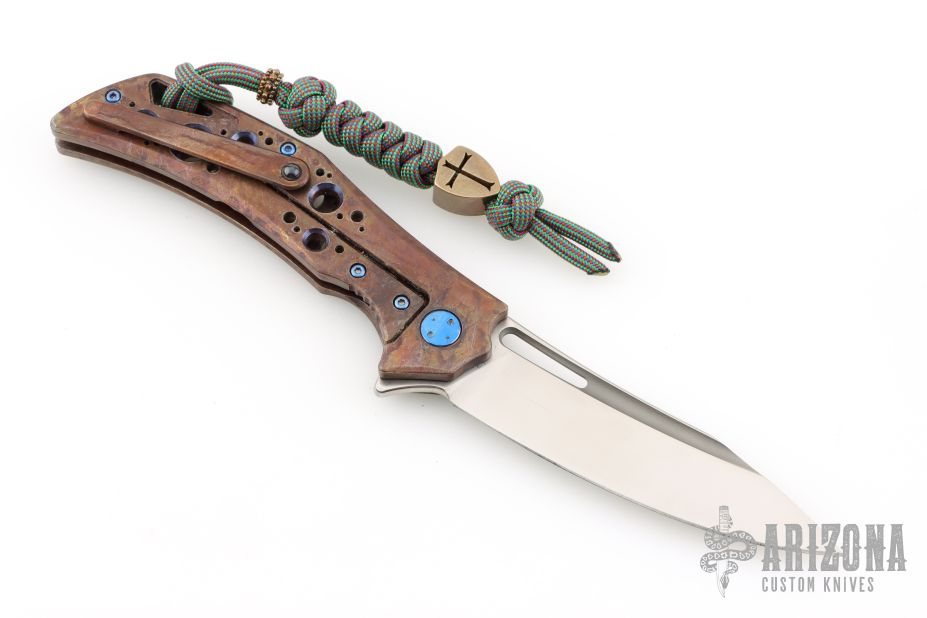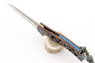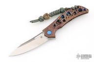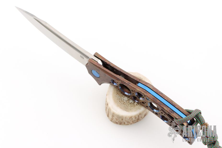 This Swish Flipper from Olamic Cutlery features a "modified wharncliffe" satin finished blade with milled fullers, thumbhole and flipper. The handle has an anodized titanium frame over a floating titanium backspacer. Matching titanium tip up clip with ceramic ball. Great detent, lock up and blade seating. Marked "Swish S533" inside the backspacer. Includes padded and zippered case and maker's card dated 3.10.21. Excellent condition.