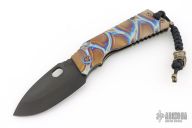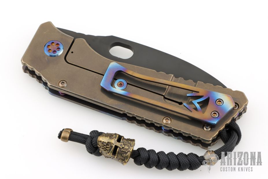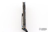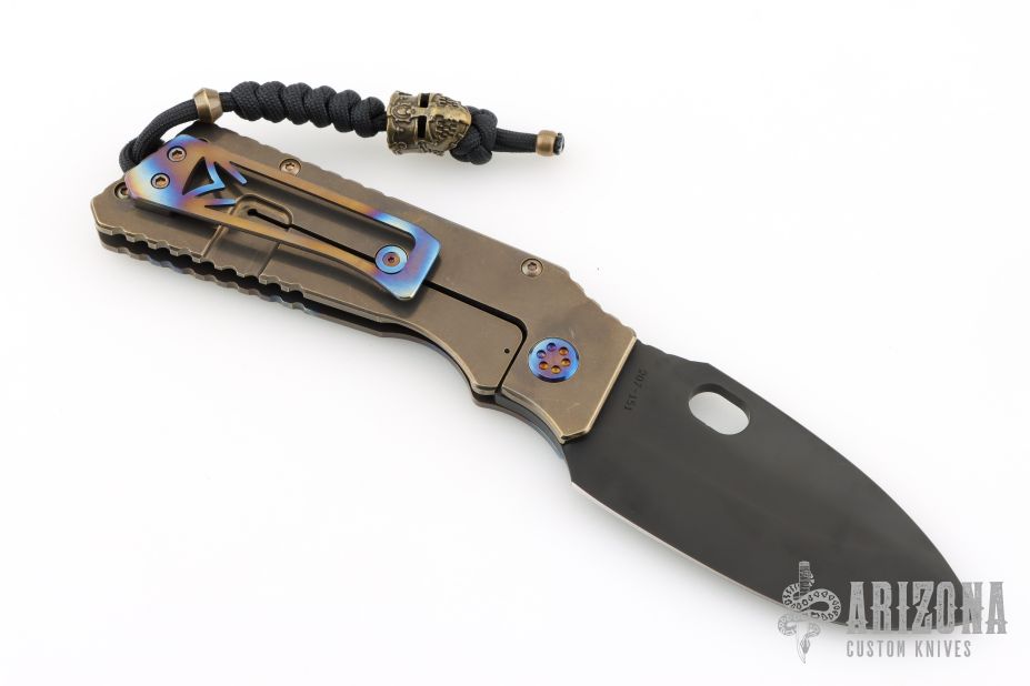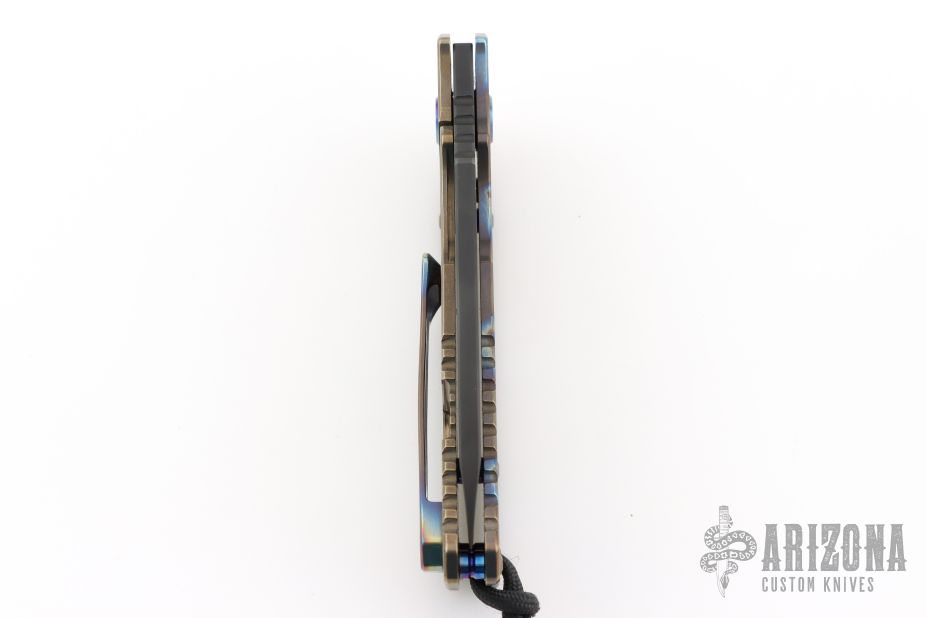This knife has a 3V black pvd finish blade with notched thumbrest. Anodized titanium frame and titanium tip up clip. Nice detent, lockup and blade seating. Includes original box, clasped case, and papers. Has a few light scratches on the clip. Excellent condition otherwise.