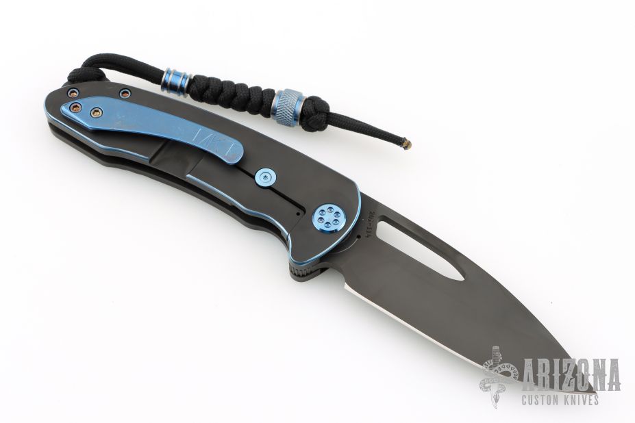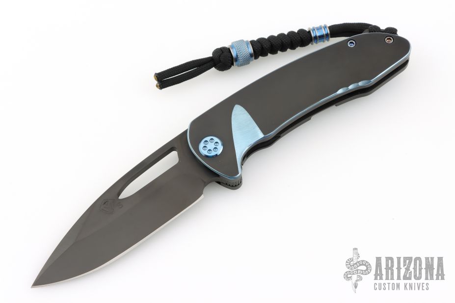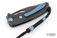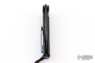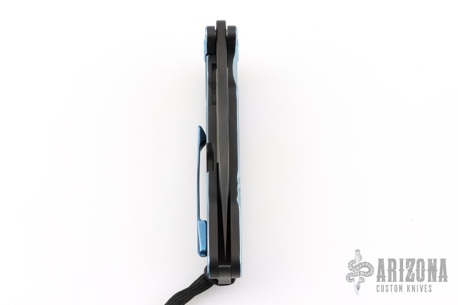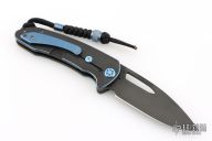 This On Belay by Medford Knives features a black PVD spear point blade with thumbhole and notched flipper. The handle has a black PVD titanium frame, blue anodized accents, stainless steel backspacer with lanyard hole, tip up tumbled titanium clip. Has some light scratches, great overall condition.