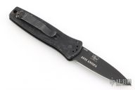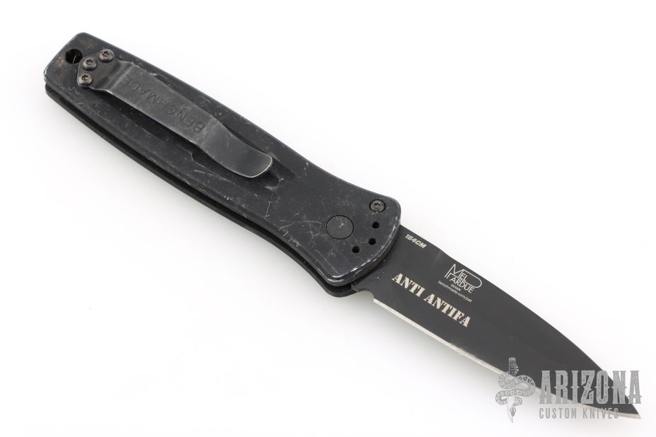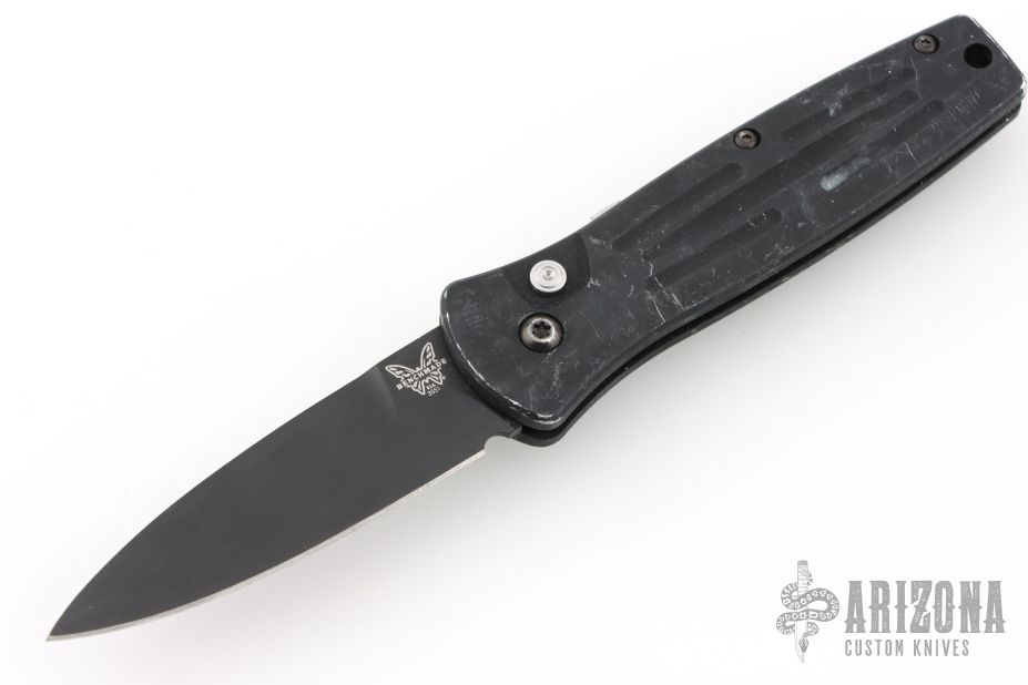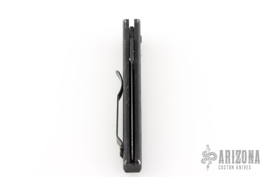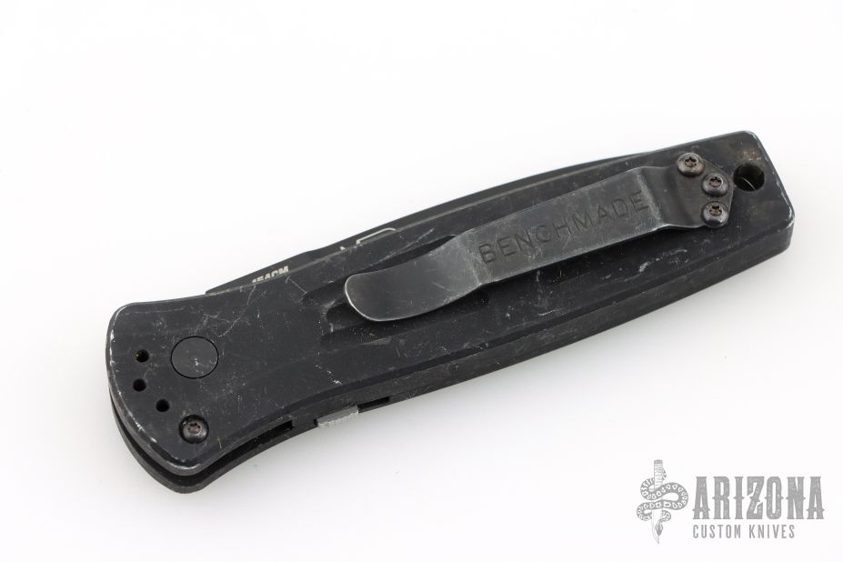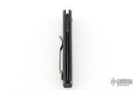 This 3551 Mini Stimulus features a black spear point blade with false top edge and a black aluminum handle with push button and safety, tip up or down reversible black stainless steel clip, lanyard hole at the butt. Has some scuffs and scratches, good condition otherwise.
