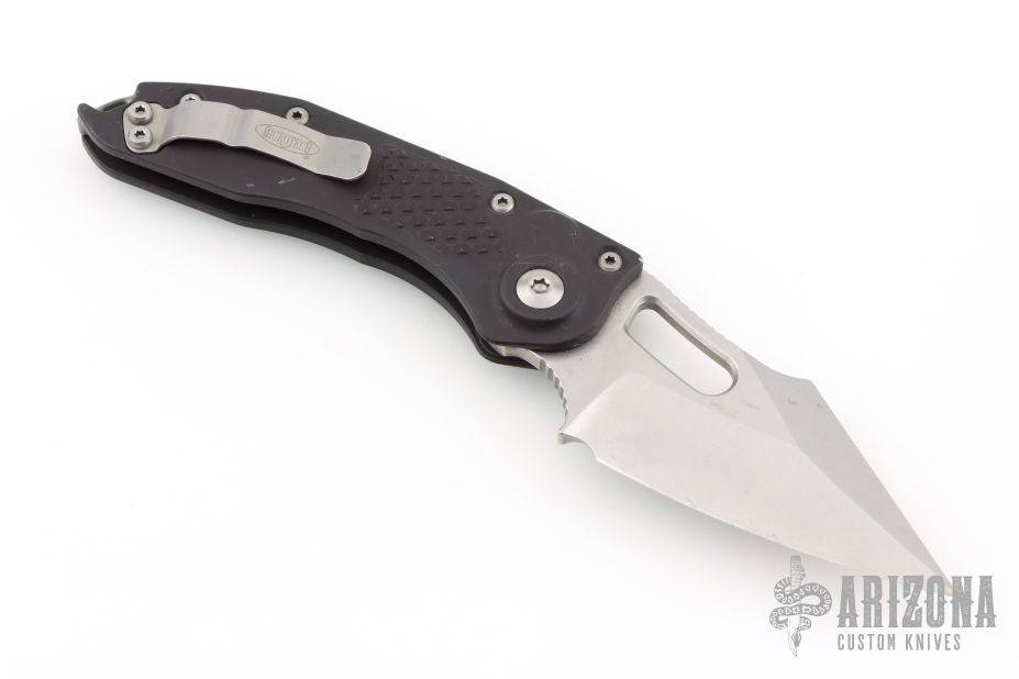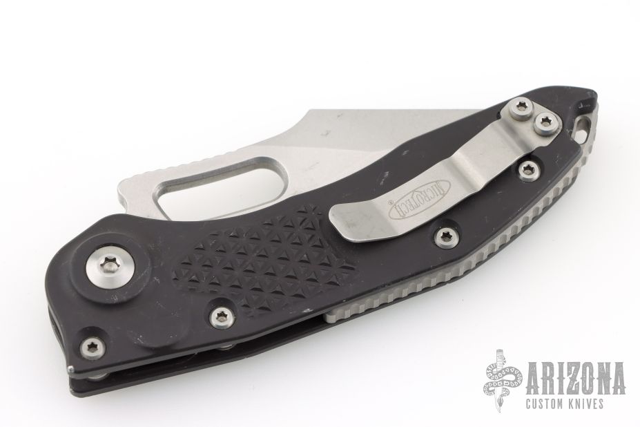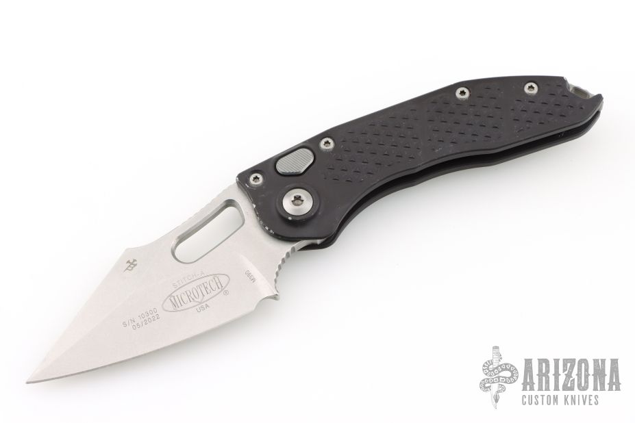 This Stitch Auto by Microtech Knives features a stonewashed blade and false top edge, notched thumb and finger rests. The handle has a black anodized and milled aluminum handle with a bead blasted titanium backspacer and a bead blasted stainless steel clip, tip up carry, lanyard hole at the butt. S/N 10300 and dated 05/2022. Has scuffs, scratches, and some dings in the frame. Good condition otherwise.