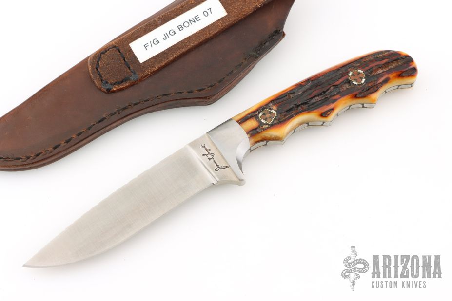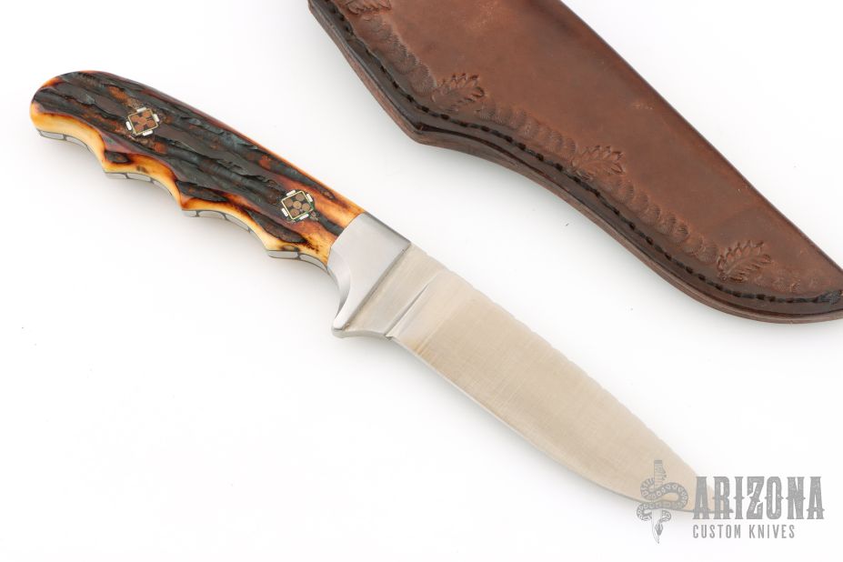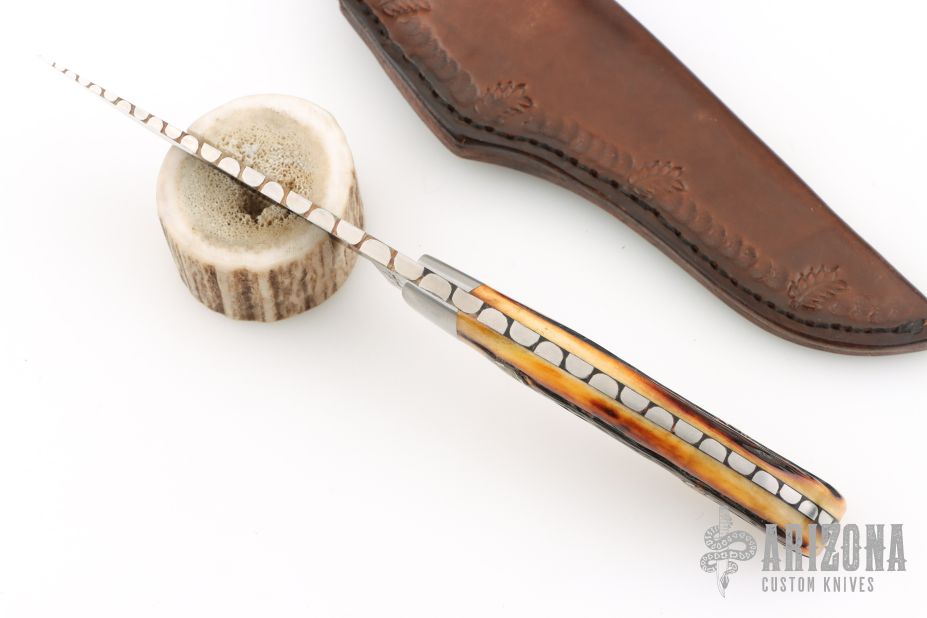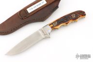 This knife by James Largent features a satin/polish finished drop point blade with fileworked blade spine, .174" blade stock and .925" blade depth, full tang construction. The handle has a pinned stag grip with dovetail bolsters. Comes with a brown leather sheath. Has a couple light scuffs, otherwise Excellent condition.