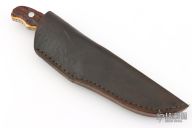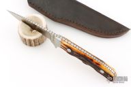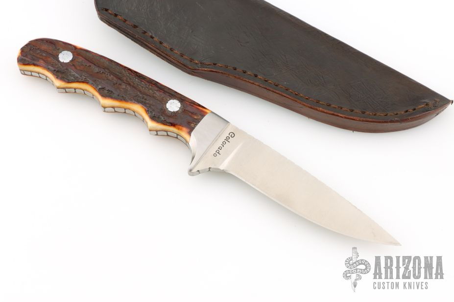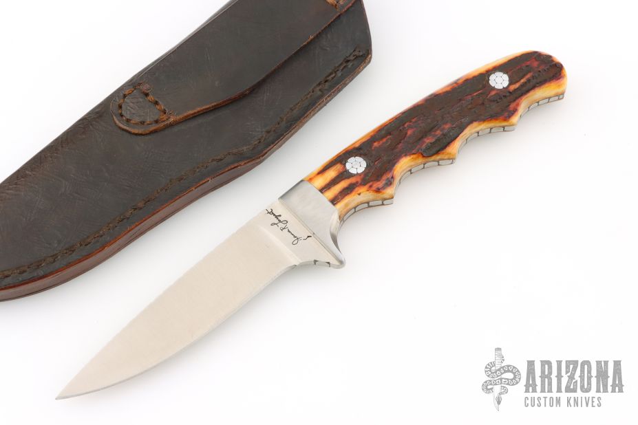 This knife by James Largent features a satin/polish finished drop point blade with fileworked blade spine, .145" blade stock and .842" blade depth, full tang construction. The handle has a pinned stag grip with dovetail bolsters. Comes with a brown leather sheath. Has a couple light scuffs, otherwise Excellent condition.