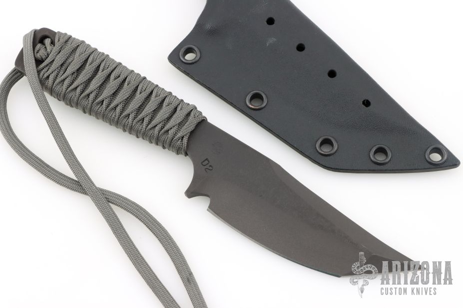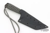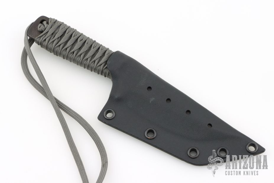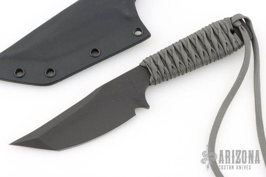The WP Dub Tanto by Mick Strider features a black blade with false top edge, .220" blade stock and 1.357" blade depth, full tang construction with grey cord wrapped handle. Comes with kydex sheath. Excellent condition.