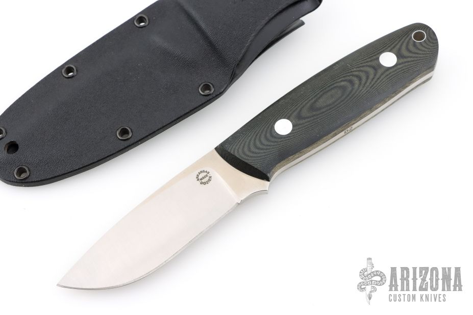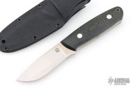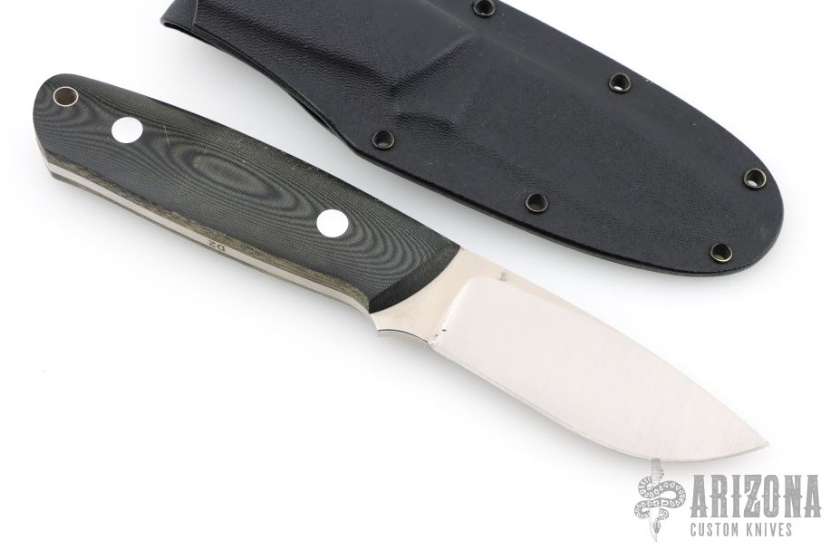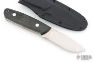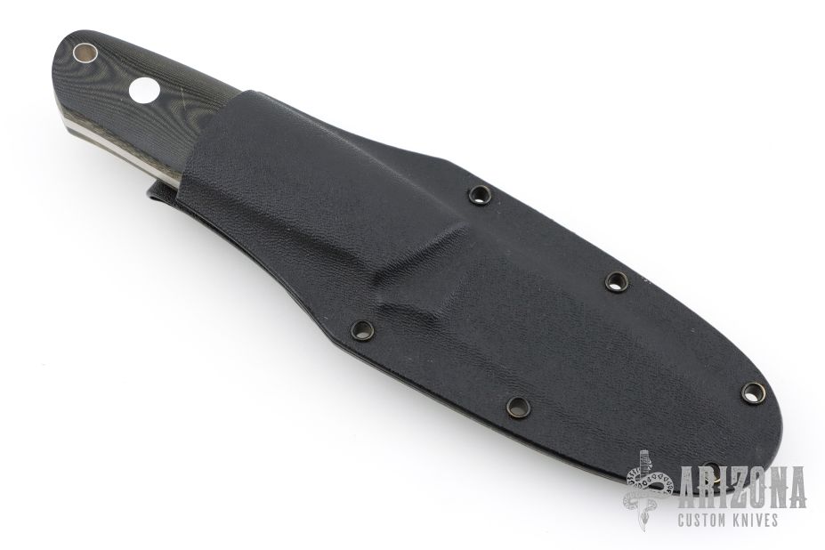 This is a KS-1 by Dozier Knives features a satin finished blade with .167" blade thickness and 1.174" blade depth, full tang construction. Black micarta scales with lanyard hole and aluminum pins. Comes with kydex sheath. Has some light scuffs and scratches, great overall condition.