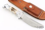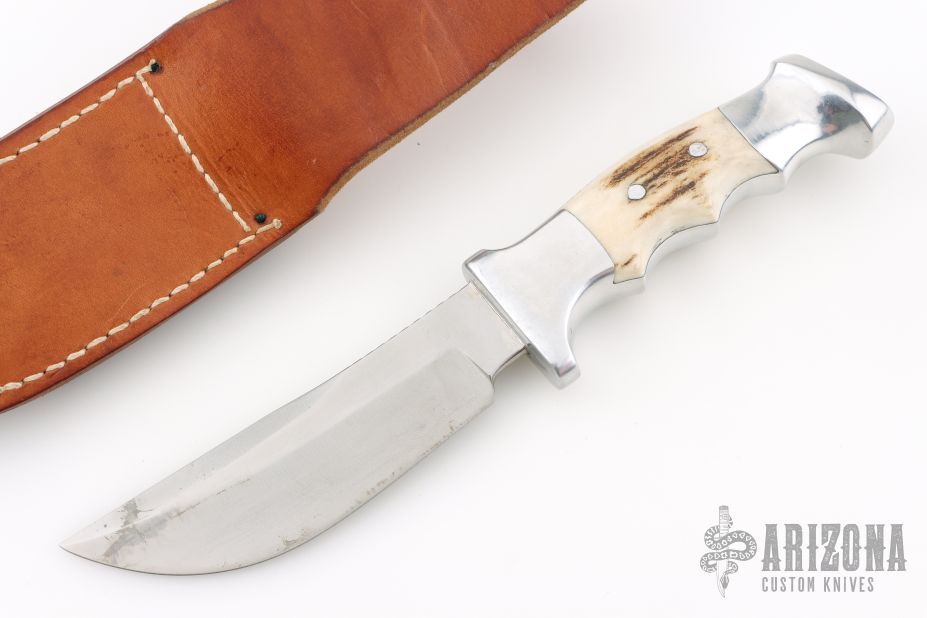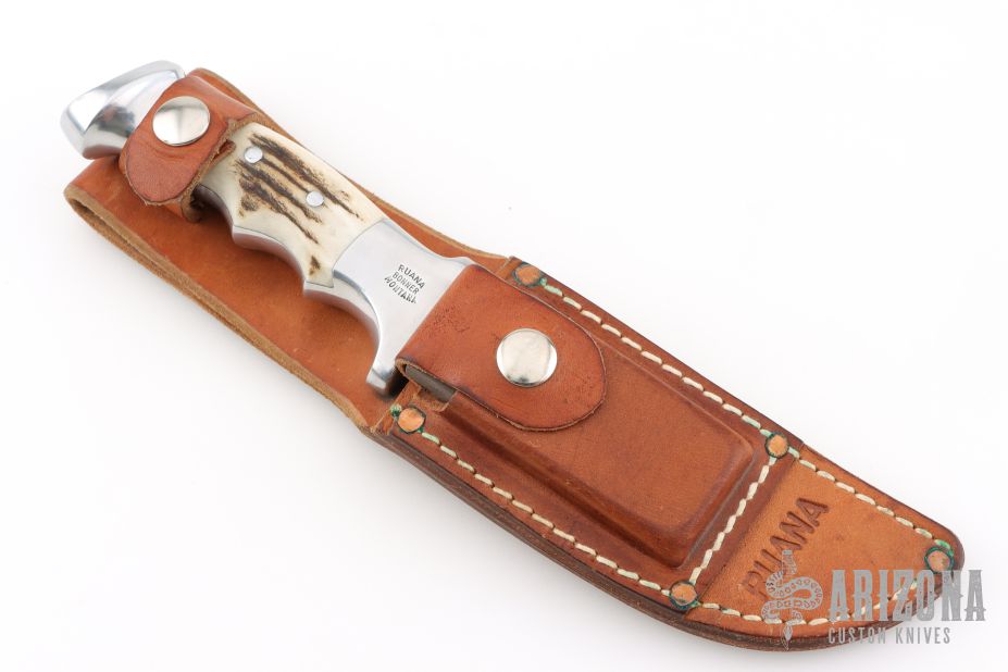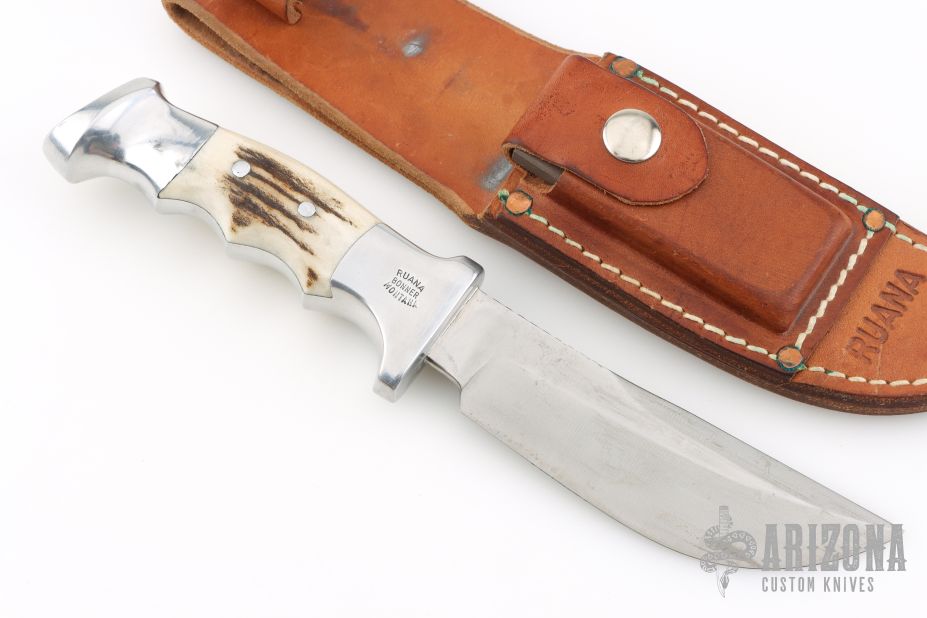 This 20B Knife from Ruana knives features a satin finished blade with false top edge and notched thumbrest, .169" blade stock and 1.362" blade depth, hidden tang construction. The handle is cast aluminum with elk antler inserts. Comes with original brown leather sheath and sharpening stone. Has some light scratches, otherwise Excellent condition.