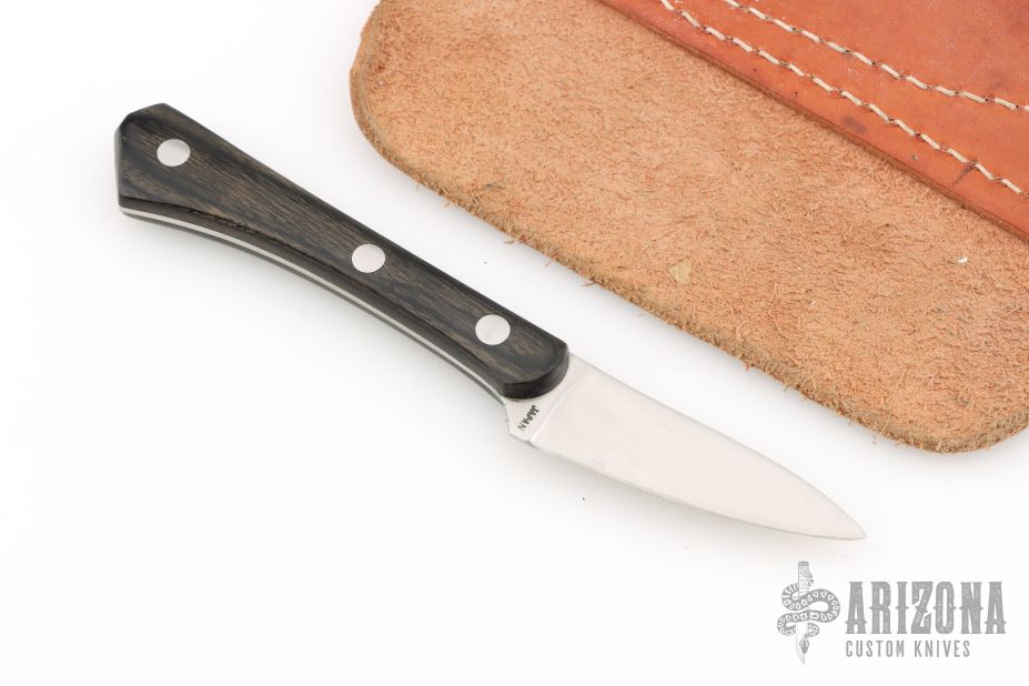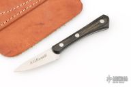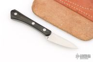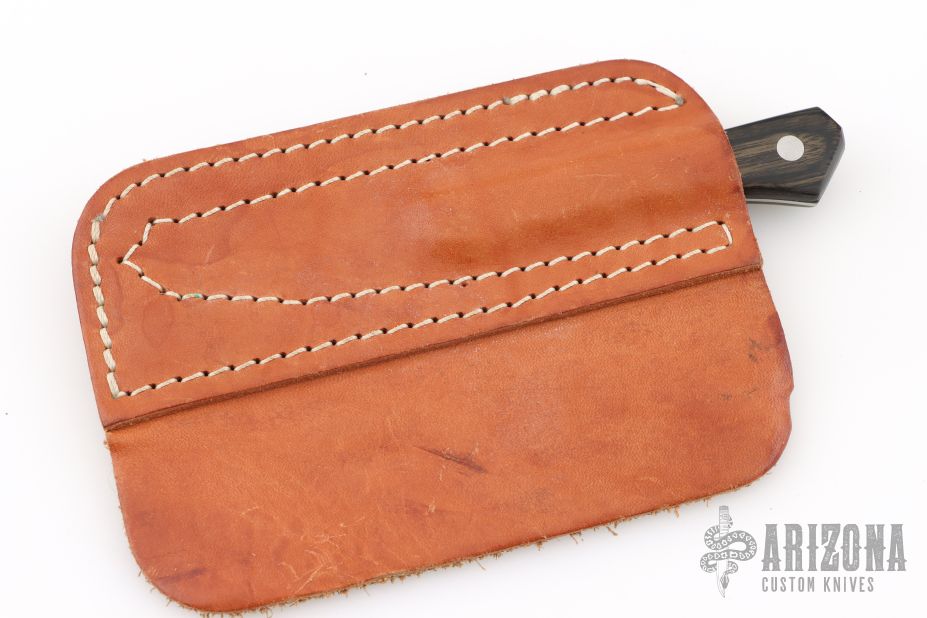 This knife by AG Russell has a satin finish blade with .059" blade stock and .781" blade depth, full tang construction with pinned wood scales. Comes with a leather back pocket sheath. Has some light scratches, great overall condition.