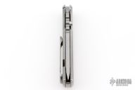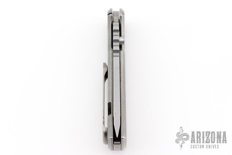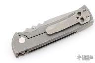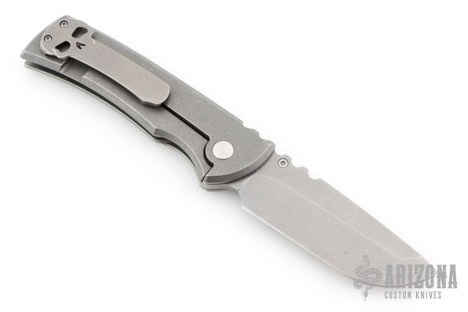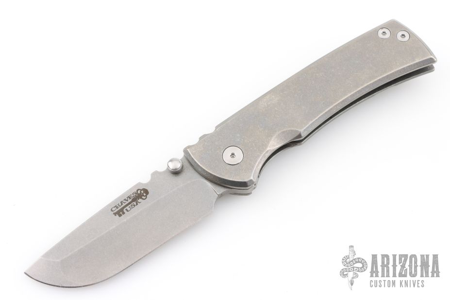 This Chaves American Made Knives Redencion 228 is a framelock folder based on the popular Redencion custom knife made by Ramon Chaves. This piece features a tumbled blade with notched thumbrest and dual thumbstuds. The handle is comprised of tumbled titanium scales over titanium barrel spacers. Matching signature "Chaves Skull" tip up clip. Has a couple light scuffs, otherwise excellent condition.