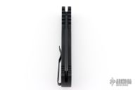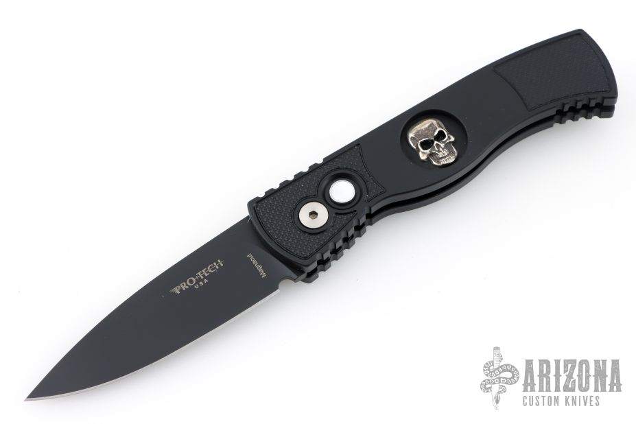 This TR-2 has a black finished blade and a black aluminum handle inlaid with a sterling silver skull designed by Bruce Shaw. MOP inlaid button and black stainless clip. S/N 109 of 150. Comes with original box, sheath and papers. Excellent condition.