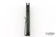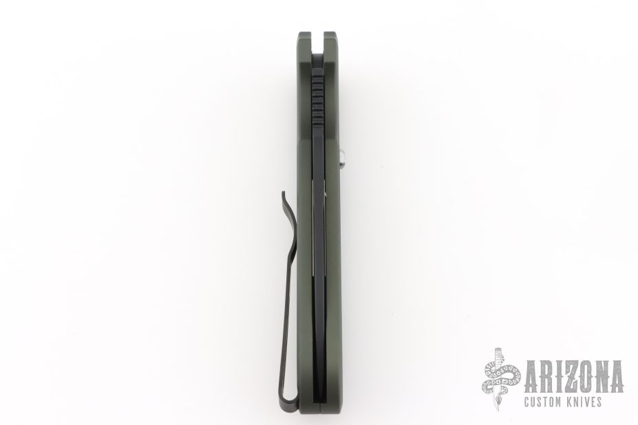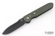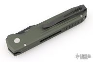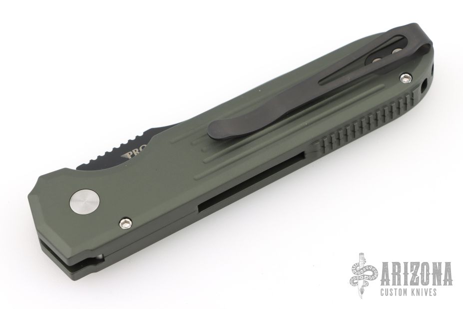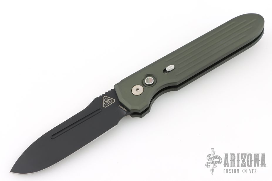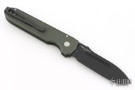 This Invictus by Pro-Tech is a Prometheus Design Werx design, it features a black blade with a notched thumbrest.  The handle has a green aluminum frame with a black stainless steel tip up clip, lanyard hole at the butt. Push button with black lip pearl inlay and safety. Comes with original box and papers. Excellent Condition.