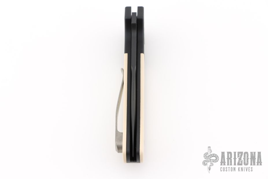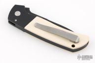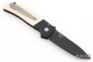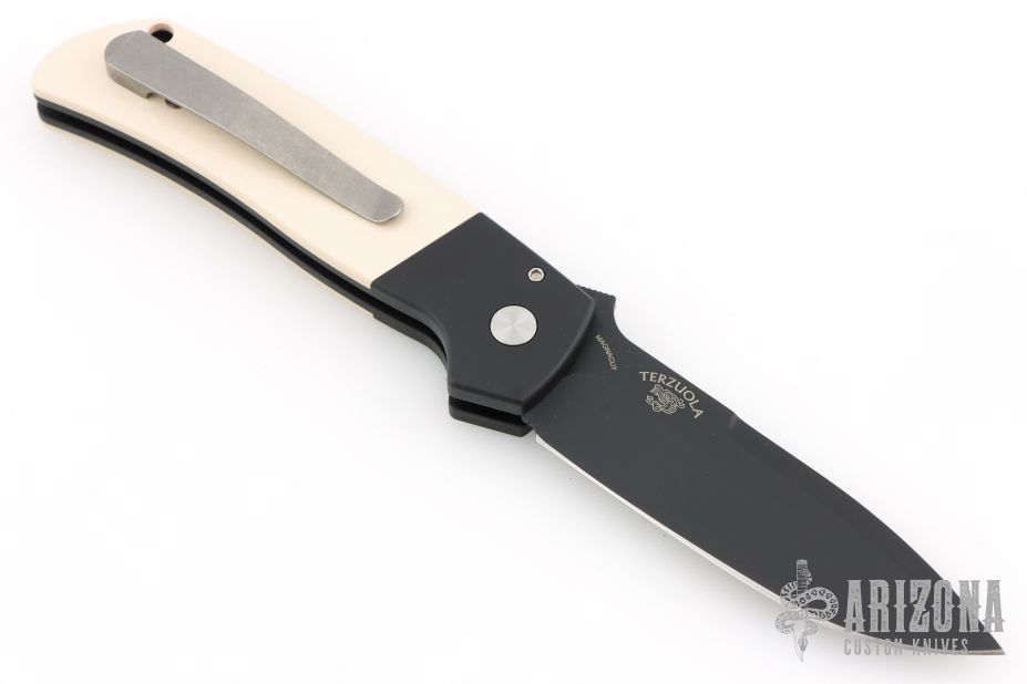 This ATCF Auto by Pro-Tech features a DLC Magnacut blade with notched thumbrest. The handle has a black aluminum frame with ivory paper micarta scales, tip up milled titanium clip with hidden screws. Comes with original box and papers. Excellent condition.