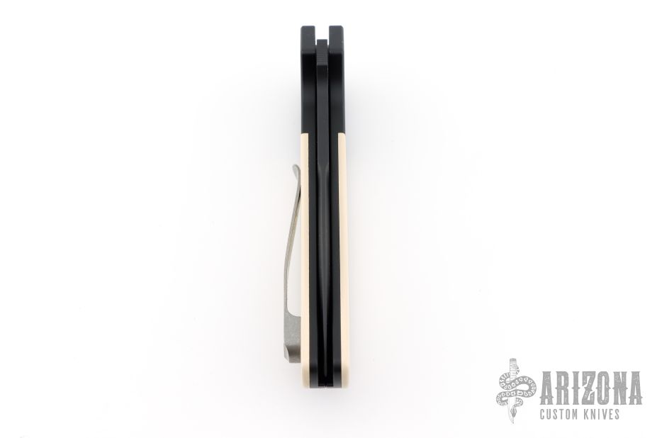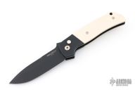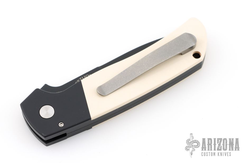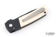 This ATCF Auto by Pro-Tech features a DLC Magnacut blade with notched thumbrest. The handle has a black aluminum frame with ivory paper micarta scales, tip up milled titanium clip with hidden screws. Comes with original box and papers. Excellent condition.