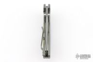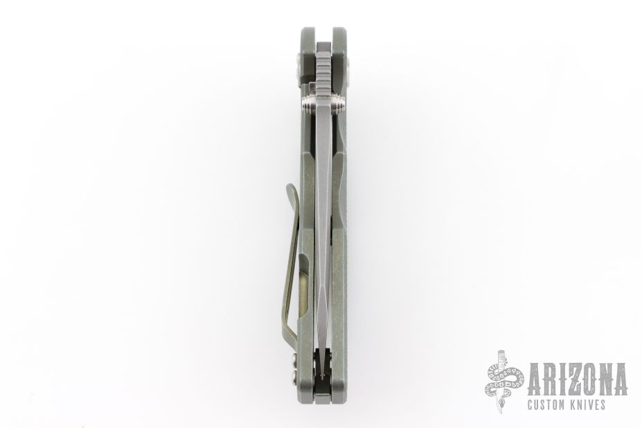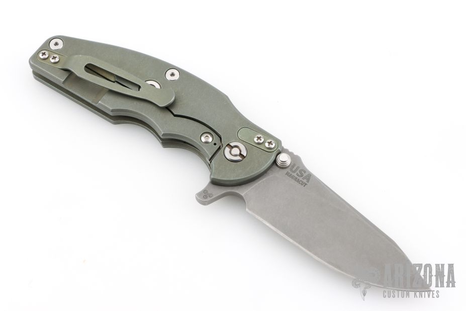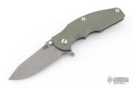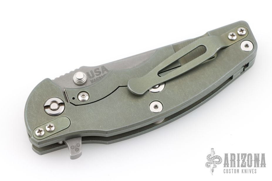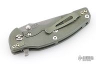This Jurassic by Hinderer Knives features a working finished, hollow ground blade with notched thumbrest and flipper. The handle has a Battle Green titanium frame with a tip up or down reversible clip and a modular backspacer. Nice detent, lockup and blade seating. This knife has the Tri-Way pivot system. Comes with original box, black G-10 scale and titanium liner, and extra washers. Excellent condition.