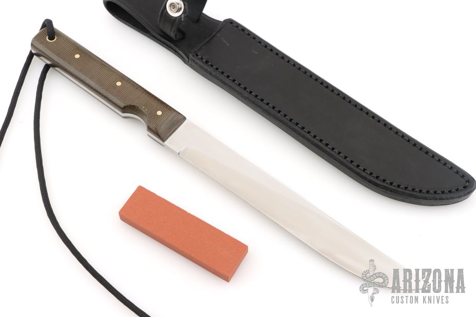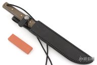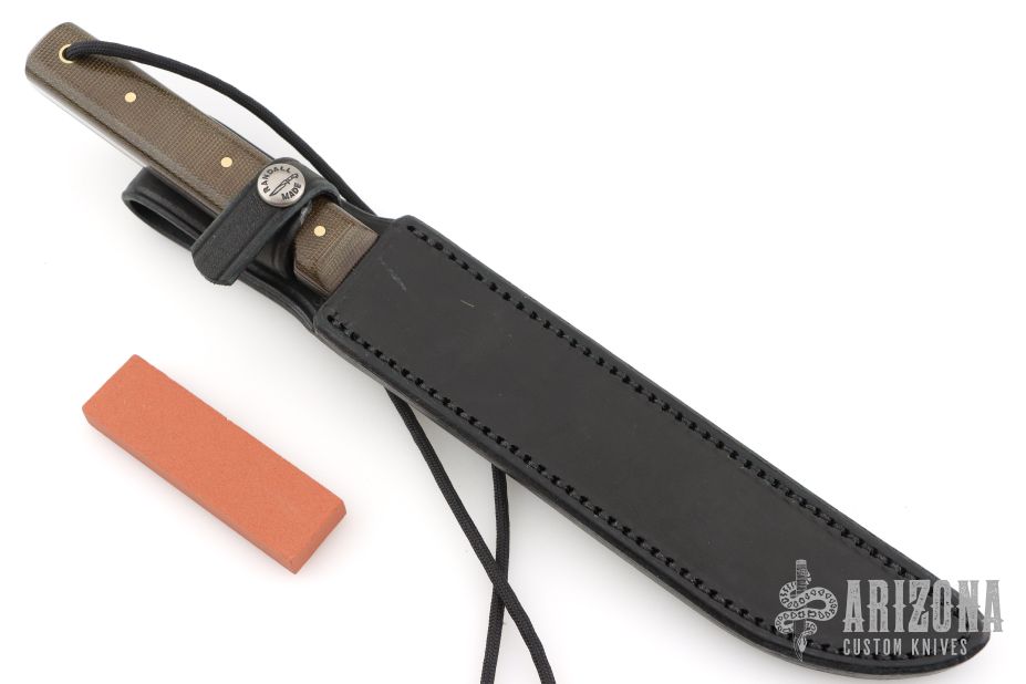 This Model 10 Salt Fisherman and Household Utility features a satin finished blade with notched thumbrest, .139" blade stock and .911" blade depth, full tang construction. The handle has green canvas micarta scales with brass pins. Brass lanyard tube with lanyard in pommel. Includes a black leather sheath and original paper wrapping. New from maker.