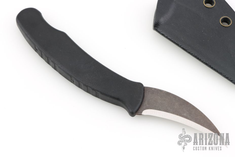This L-via by Kopis Design features an acid stonewash finish hawkbill blade with .061" blade stock and .784" blade depth, hidden tang construction. The handle is glass filled nylon. Comes with a kydex sheath and original box. Has a couple light scuffs, excellent condition otherwise.