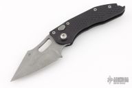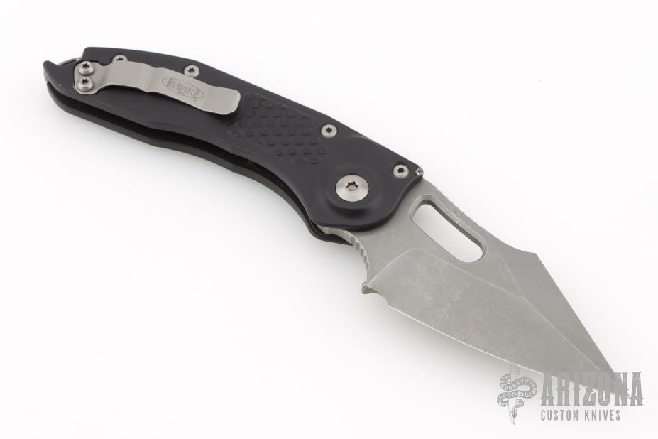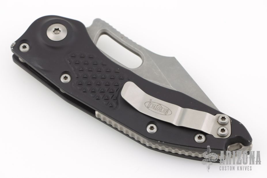 This Stitch Auto by Microtech Knives features an Apocalyptic finished blade and false top edge, notched thumb and finger rests. The handle has a black anodized and milled aluminum handle with a bead blasted titanium backspacer and a bead blasted stainless steel clip, tip up carry, lanyard hole at the butt. S/N of 0074 and dated 12/2016. Has a couple dings on the frame edges, otherwise good condition.