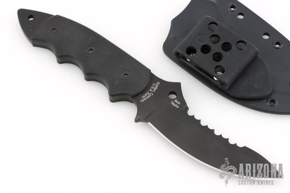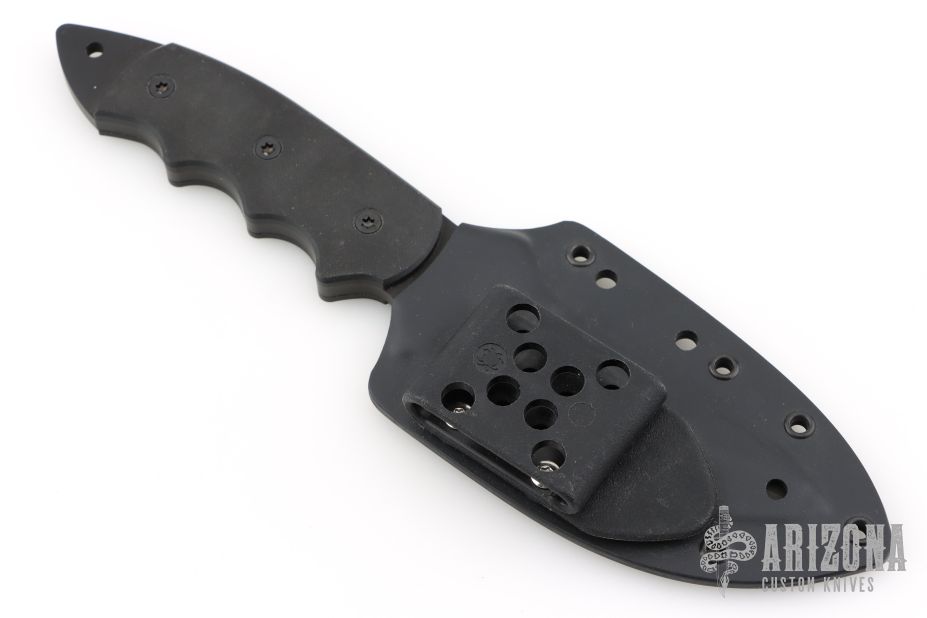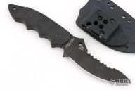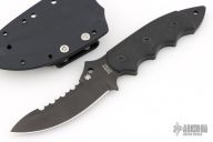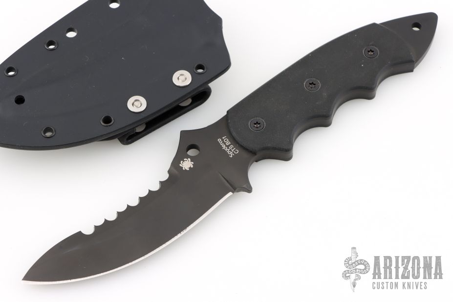 This Pygmy Warrior from Spyderco features a black coated upswept blade with sawteeth on spine. .168" blade stock and 1.52" blade depth. The handle is comprised of black G10 scales over full tang construction. Exposed tang pommel with lanyard hole. Includes original box, papers and kydex sheath. Listing also includes an extra set of scales. Has a few light scuffs, otherwise Excellent condition.