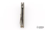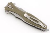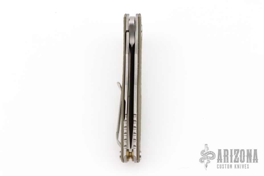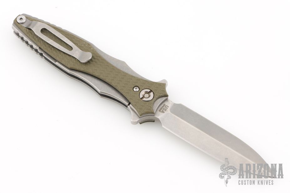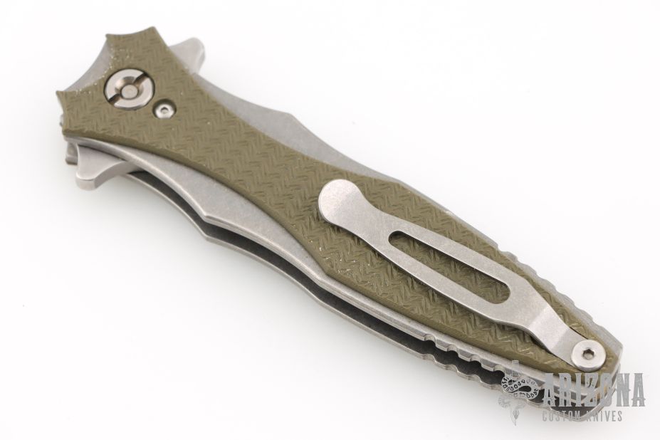 This Maximus by Hinderer Knives features a stonewashed Dagger style blade with top edge and flipper. The handle is comprised of textured green G-10 over a stonewashed titanium frame. The tumbled titanium tip up clip is reversible for right or left hand carry. Great blade seating, detent and lock up. Includes original box and card. Has some light scuffs, excellent condition.