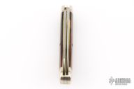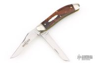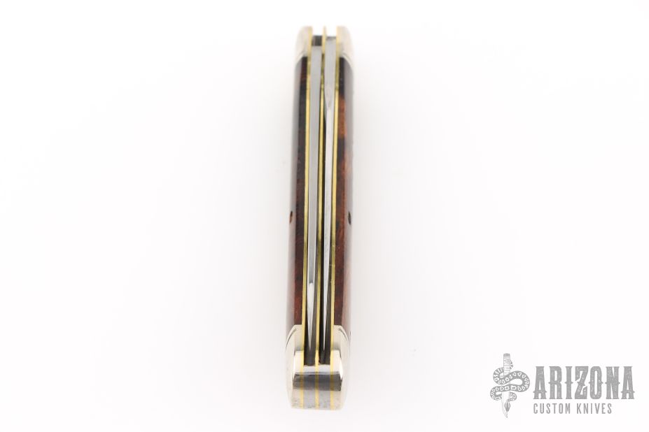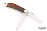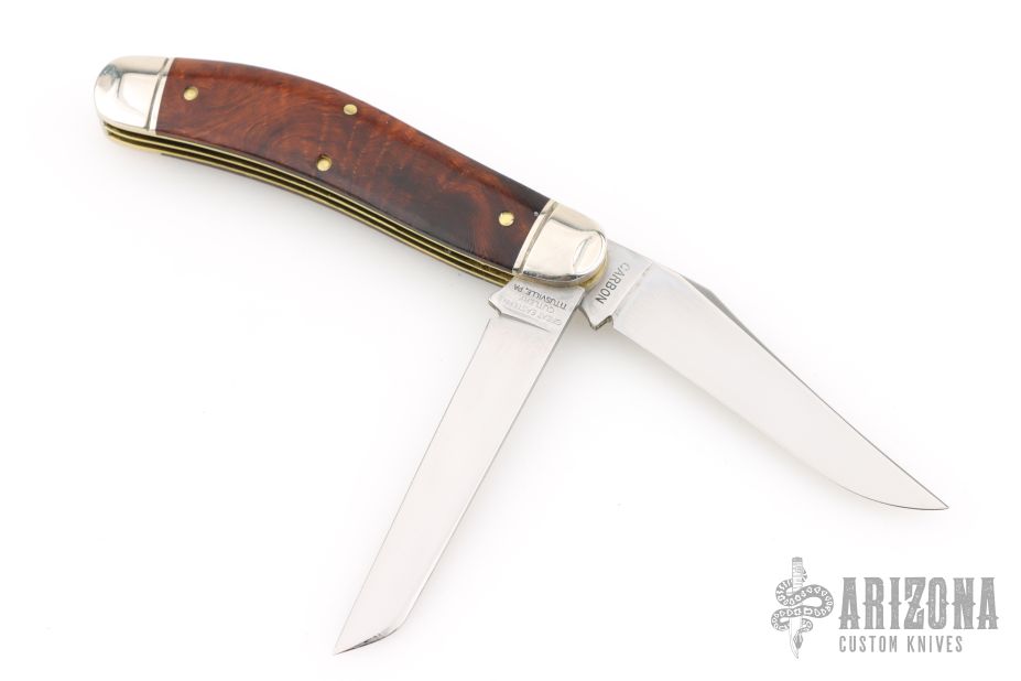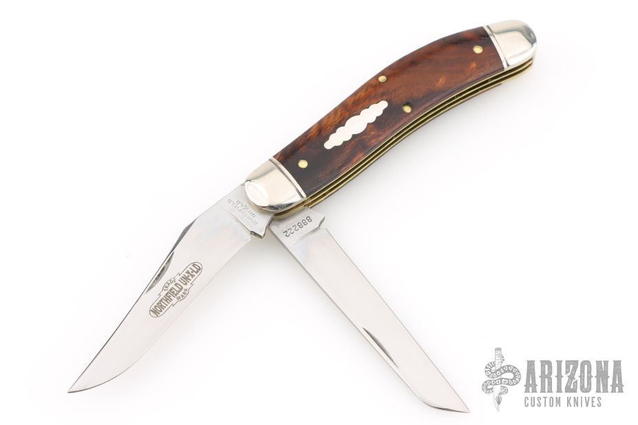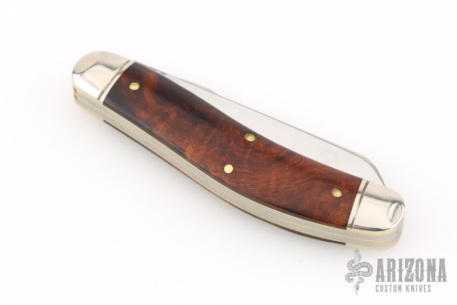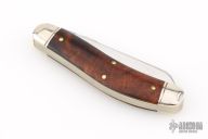 This Bayou Trapper by Northfield Knives features polished blades with nail nicks. The handle has nickel silver pinched and fluted bolsters, wood covers with a nickel silver escutcheon, brass liners/pins. Has half stops. Comes with original tube and paper. Excellent condition.