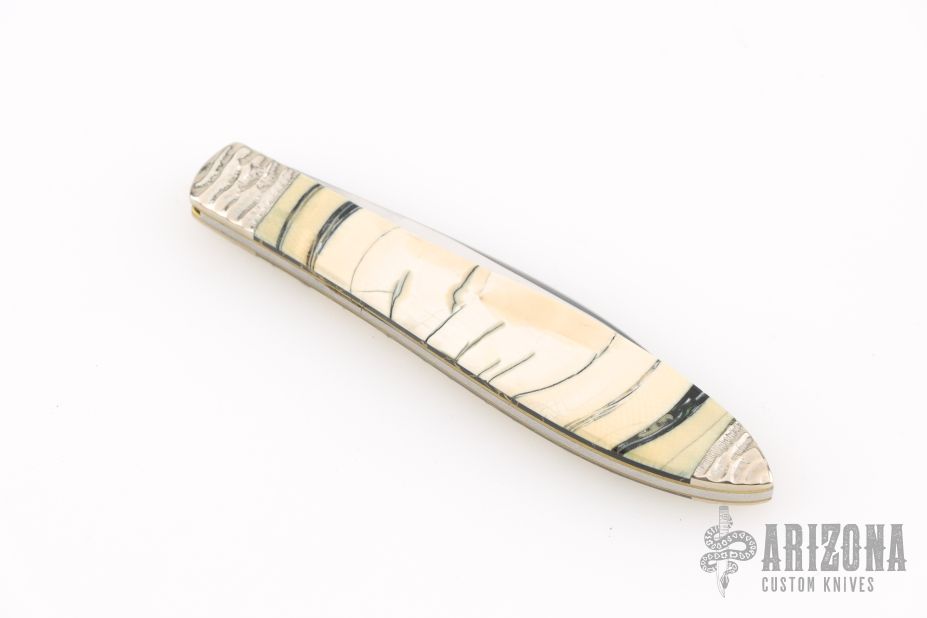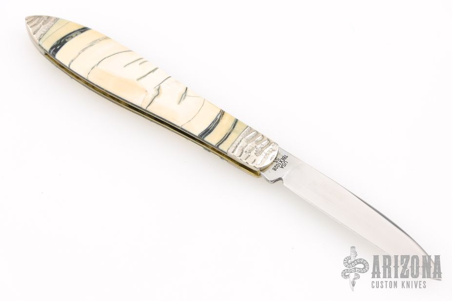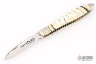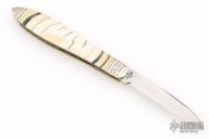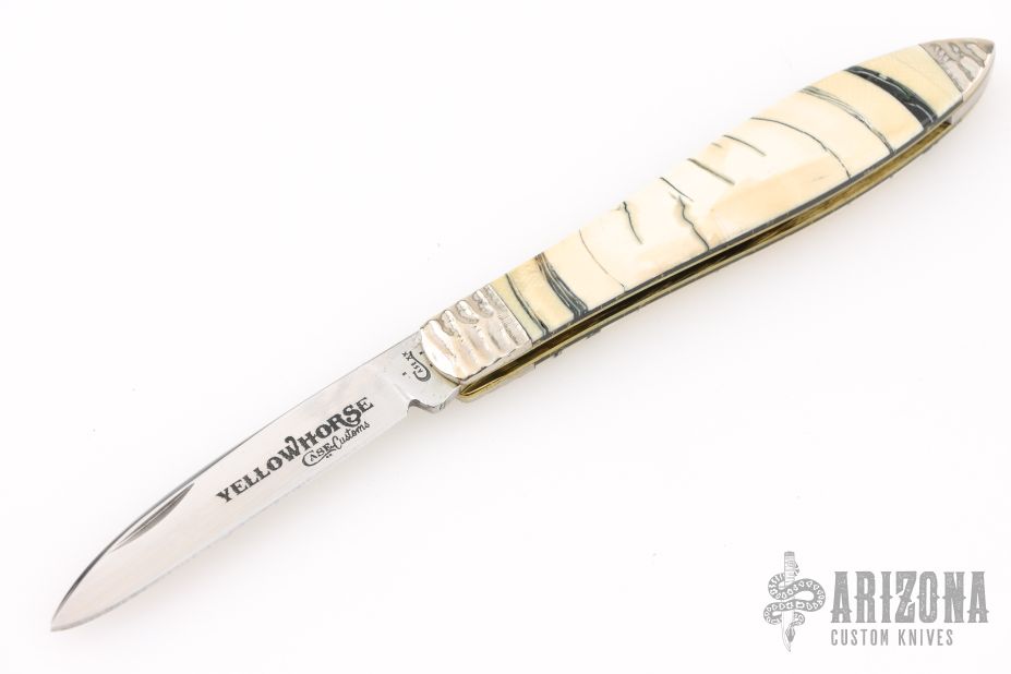 This Tony Bose designed Case is a Yellowhorse production. It features a polished drop point blade with nail nick and false top edge. The handle has textured nickel silver bolsters, mammoth ivory covers, and brass liners. Comes with original box. Excellent condition.