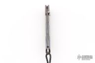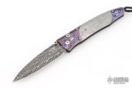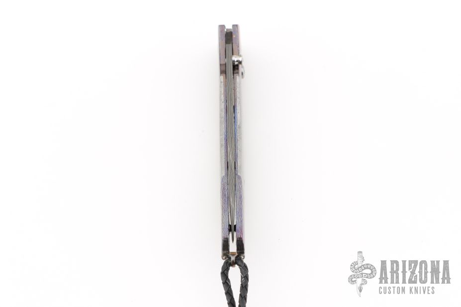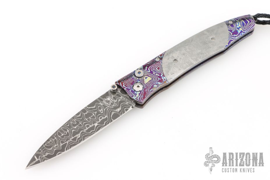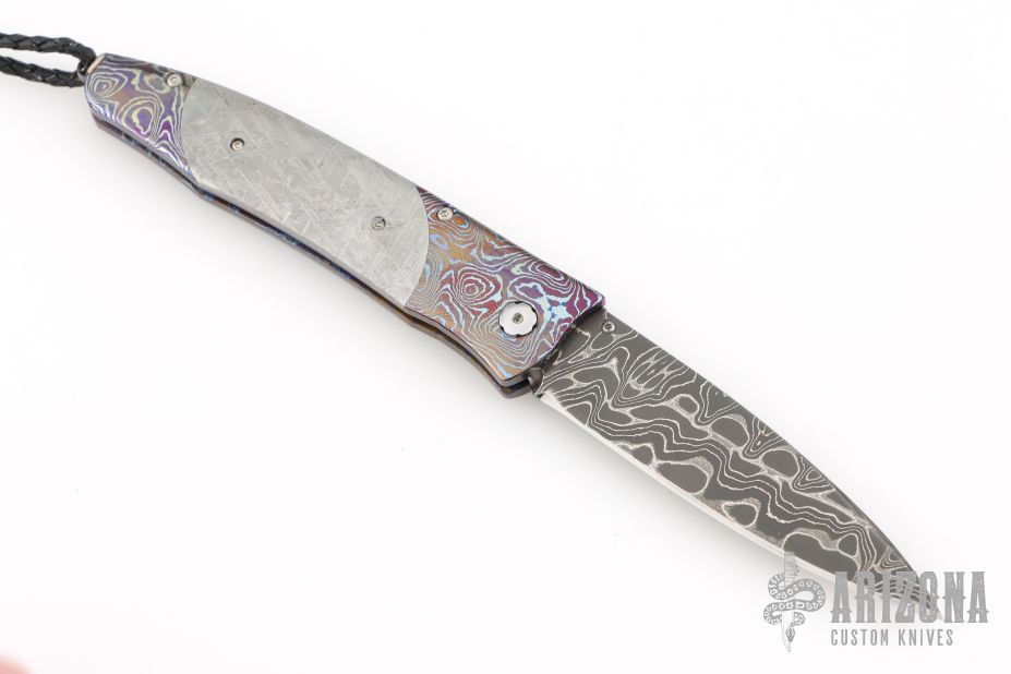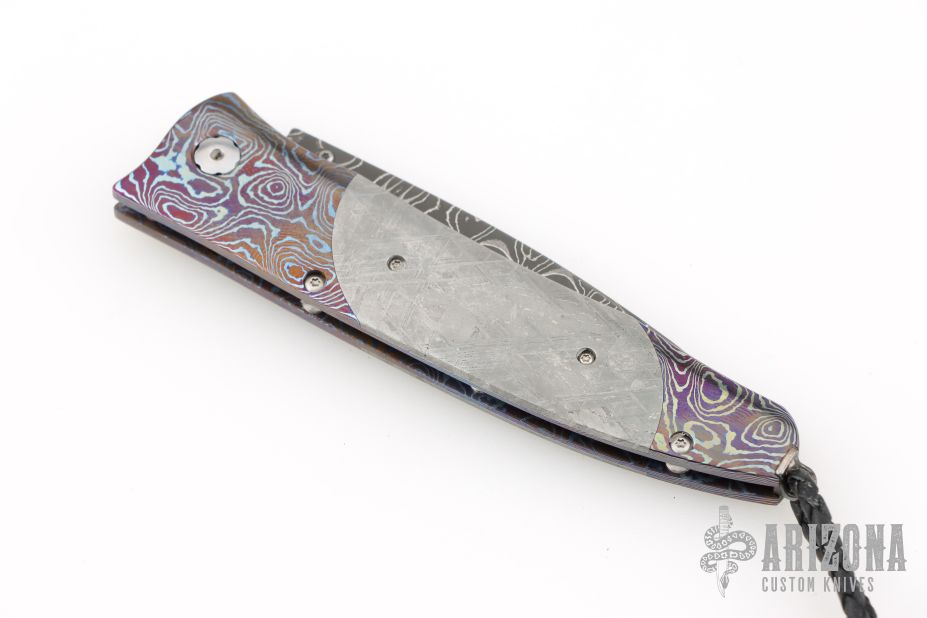 This B30 GenTac Galaxy button lock folder by William Henry Knives features an "Intrepid" Damascus blade with single thumbstud with sapphire inlay. The handle is crafted from two solid pieces of heat blued Chad Nichols MokuTi with Gibeon Meteorite inlays, sapphire inlaid push button. Includes original box, sheath and certificate of authenticity dated October 17, 2017. Excellent condition.