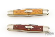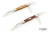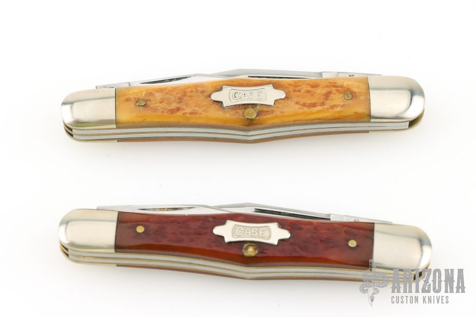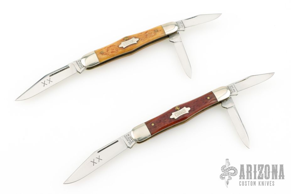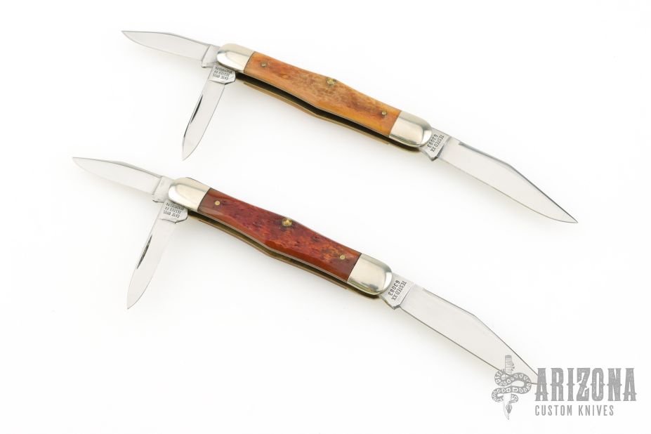 This 3-blade whittler by Case knives features polished blades with nail nicks. The handle has nickel silver bolsters and cap, antique red bone covers, brass liners and stainless springs. Comes with original box and papers. Excellent condition.