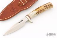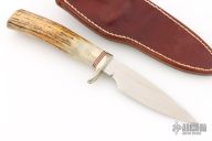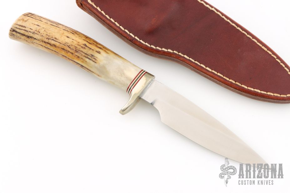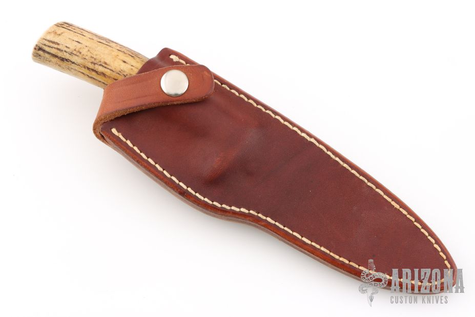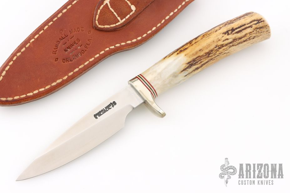 The Model 26 by Randall Made Knives is an excellent skinning and outdoors knife with drop point satin finished blade with .162" blade stock and .964" blade depth, hidden tang construction. The handle has a nickel silver guard, stag grip with red/white/blue spacers. Comes with brown leather sheath. Has some light scuffs, excellent condition.