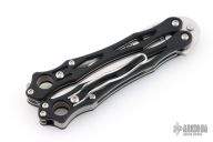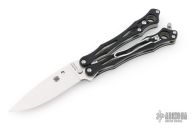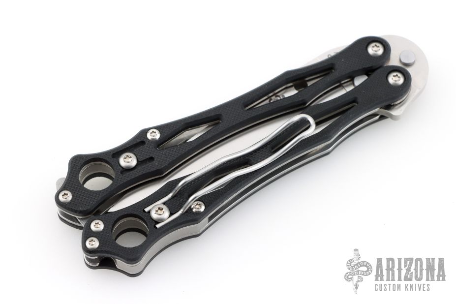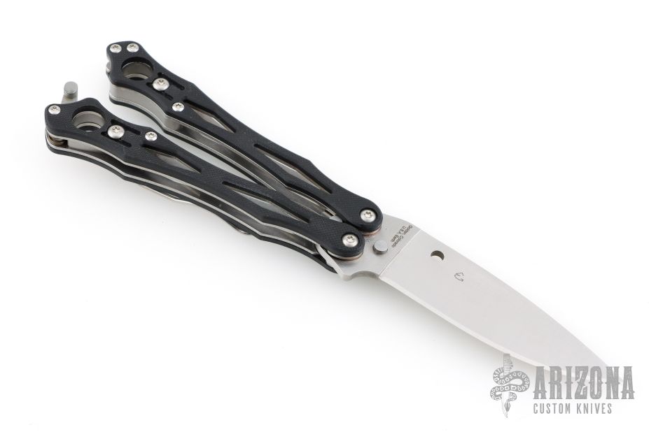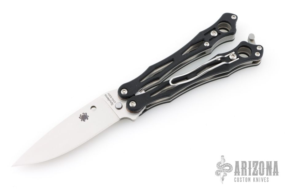 This Spyderfly 2 Balisong by Spyderco has a satin finished blade. Handle is black G10 over stainless steel liners and stainless steel paper-clip style pocket clip. Comes with original box. Excellent condition.