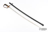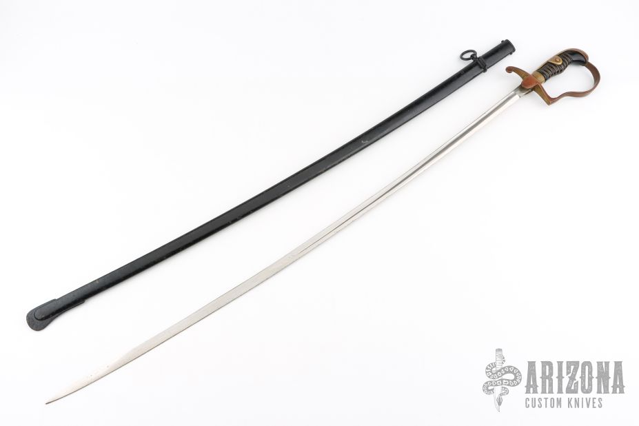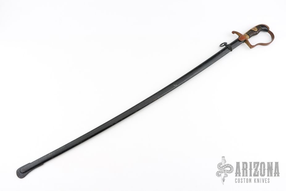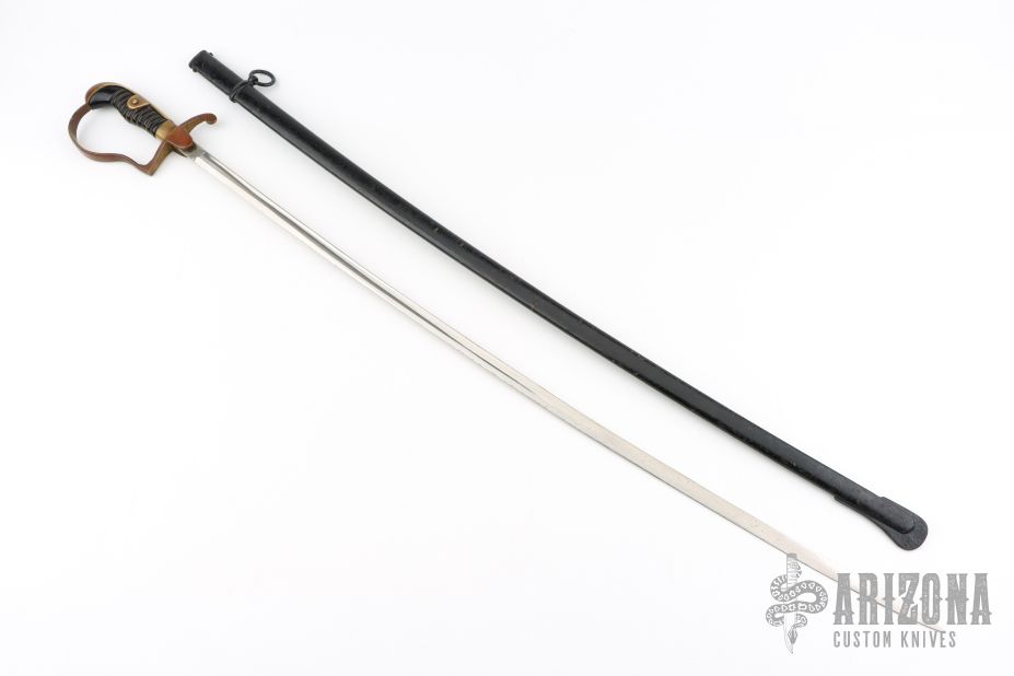 This is a German nickel plated saber for Artillery Wachtmeister Osthues with a black lacquered scabbard with one ring. A slightly curved blade with unsharpened edges, marked with manufacturers logo, Paul Weyersberg & Co, Solingen, on a ricasso. Brass D-Guard hilt, plain style pommel and backstrap, black celluloid grip with brass wire wrap. Appears to have been and carries, his small dings in the edges, a ding here and there on the brass, the handle is a bit loose, otherwise good condition for its age. #244 on the guard.