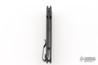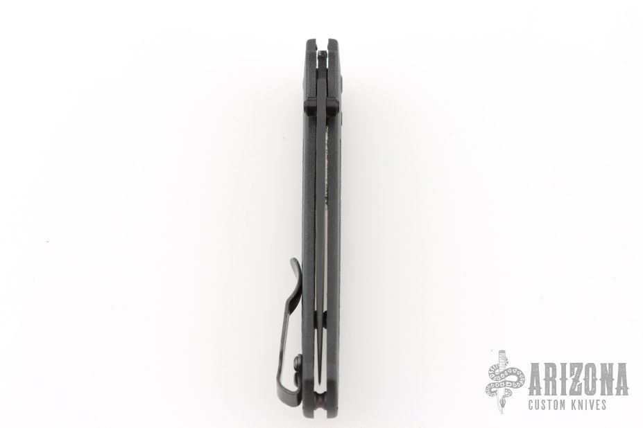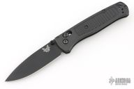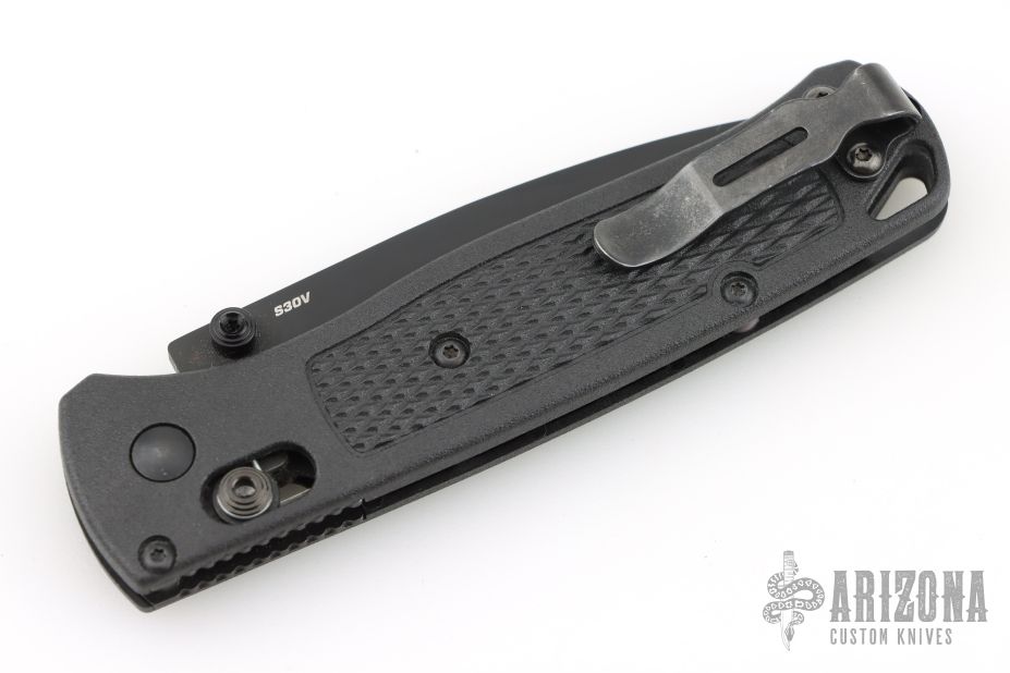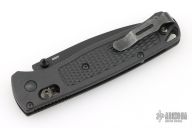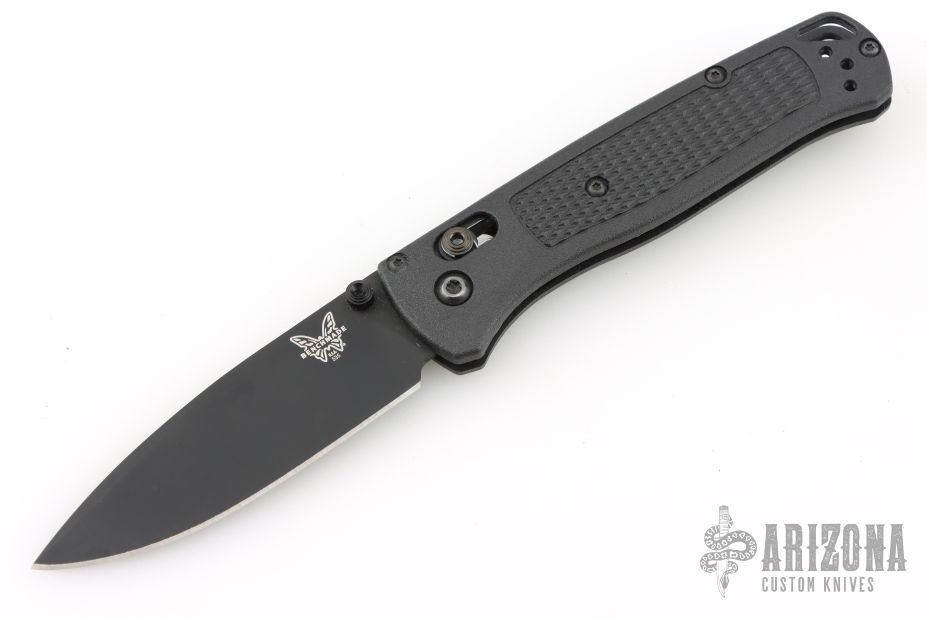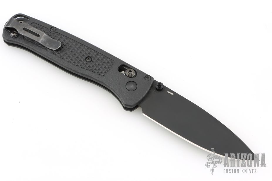The Bugout features a drop point blade with a flat dark Cerakote finish. It's a manual opener with ambidextrous thumb studs. This AXIS lock has a milled aluminum frame and black hardware, a black mini deep-carry pocket clip, and a lanyard hole. Includes original box, pouch, and papers. Has a couple light scuffs, otherwise Excellent condition.