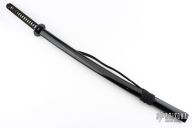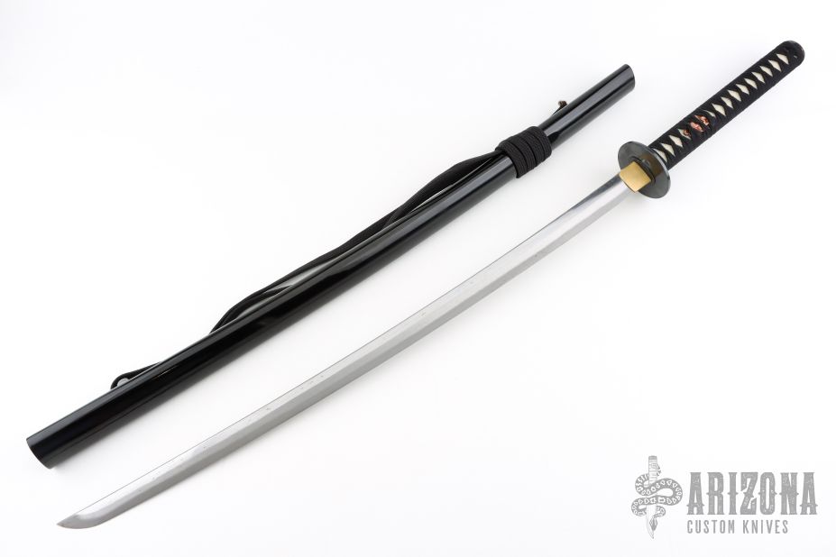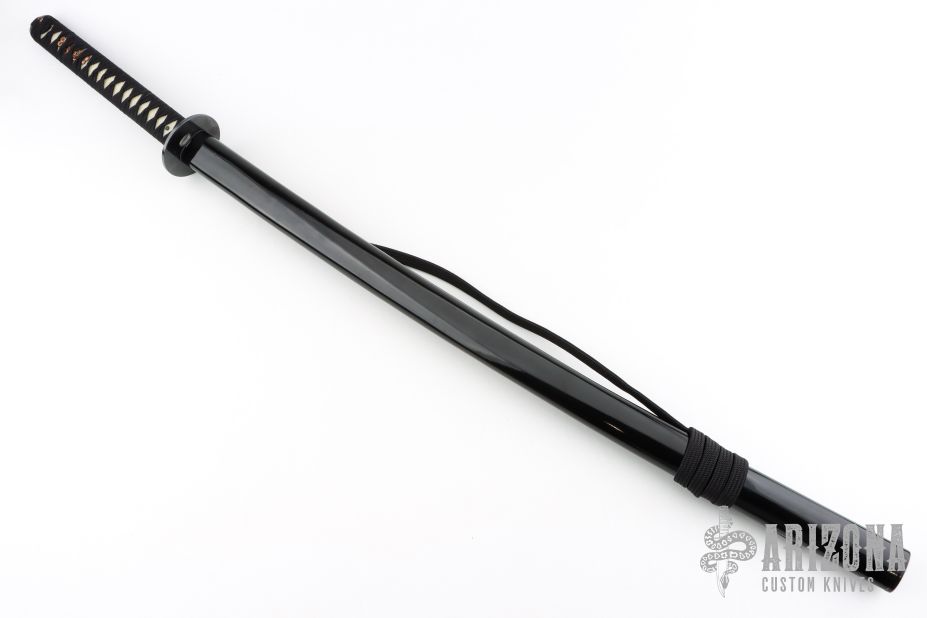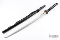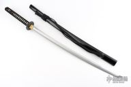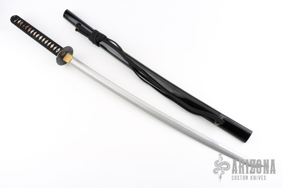 This Katana by Cold Steel features a satin finished blade with hamon, .280" blade stock and 1.179" blade depth, hidden tang construction. The handle has a black steel tsuba, brass habiki, black steel seppas, black steel fuchi and kashira, black tsuka-ito over white ray skin, brass flower menuki. Comes with a black lacquered wood saya. Comes with sword bag. Has some stains and scratches, otherwise good condition.