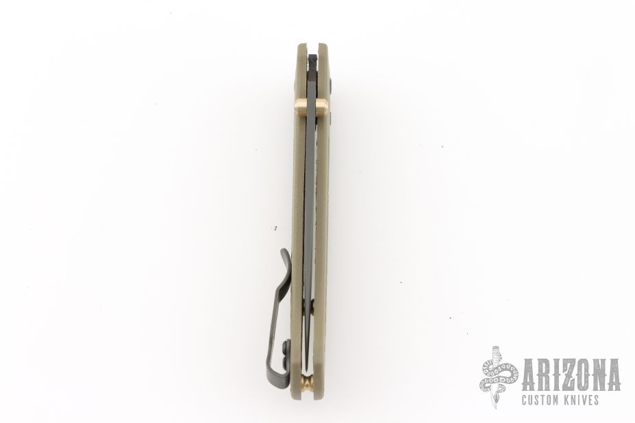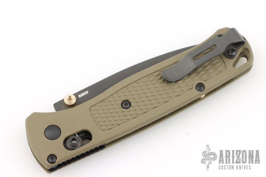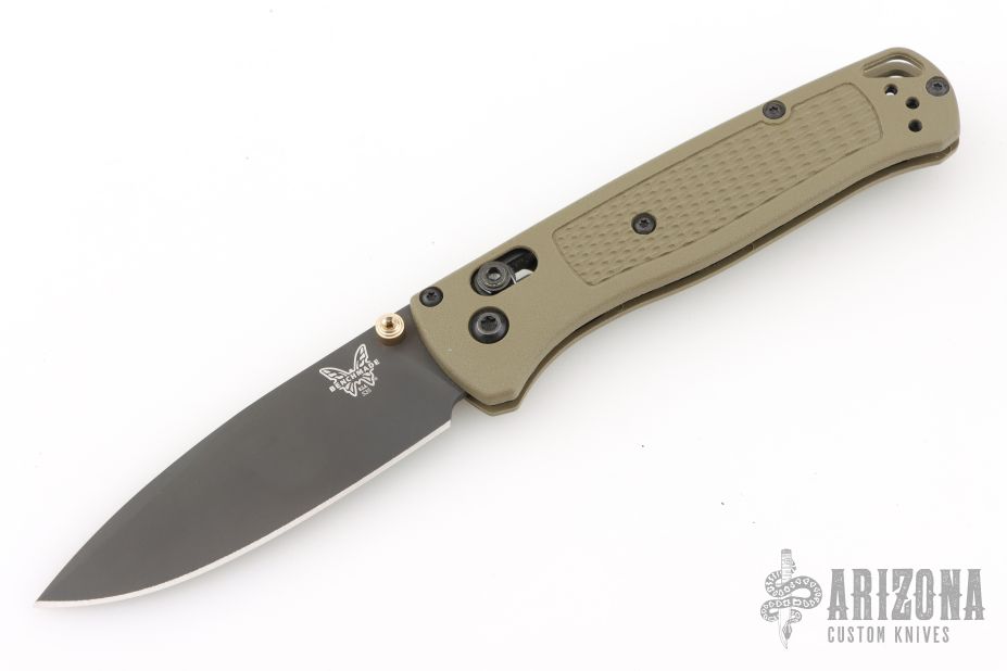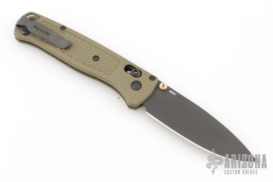The Benchmade Bugout features a drop point blade with a grey Cerakote finish. It's a manual opener with ambidextrous thumb studs. This AXIS lock has an OD handles with brass spacers and black hardware, a black mini deep-carry pocket clip, and a lanyard hole. Includes original box, pouch and papers. Has a couple light scuffs, otherwise Excellent condition.