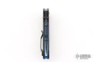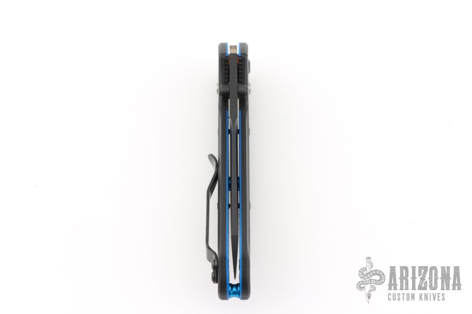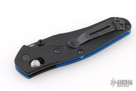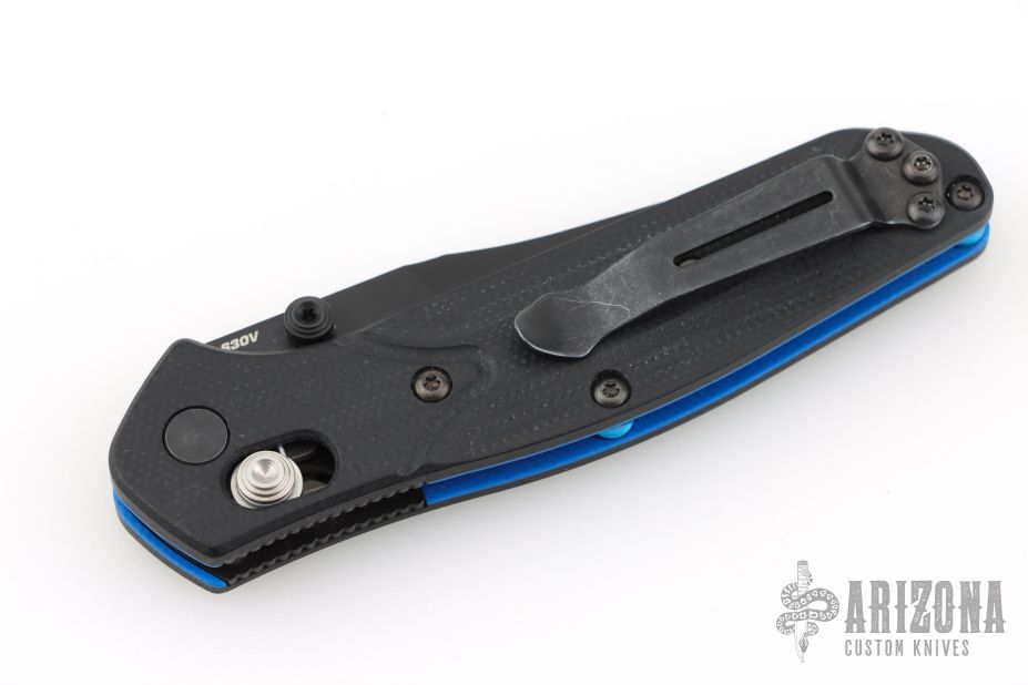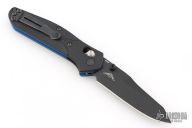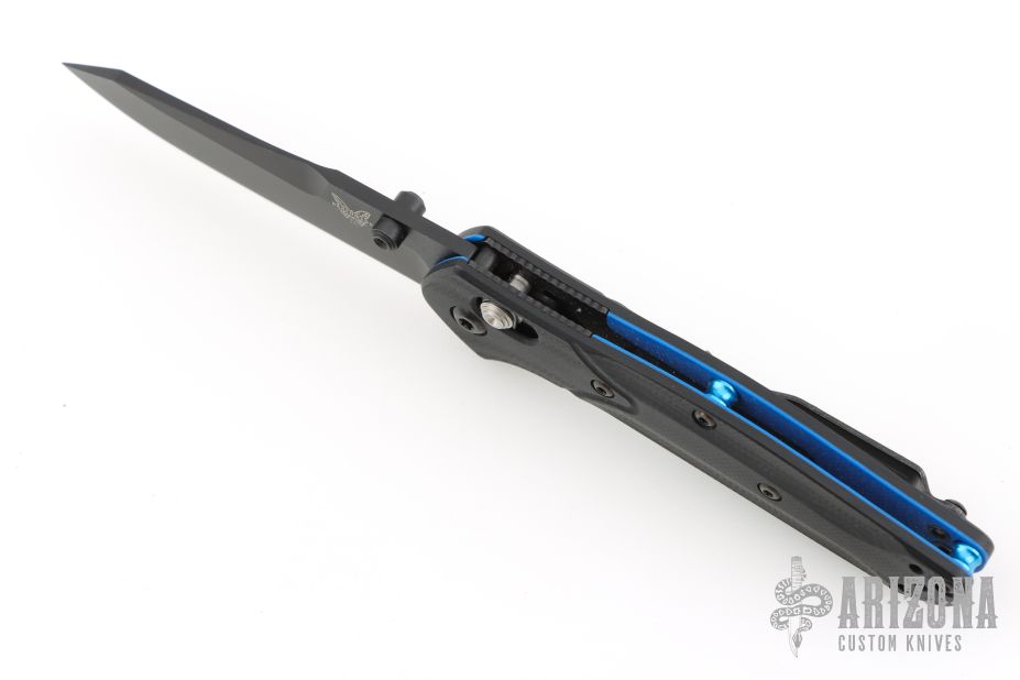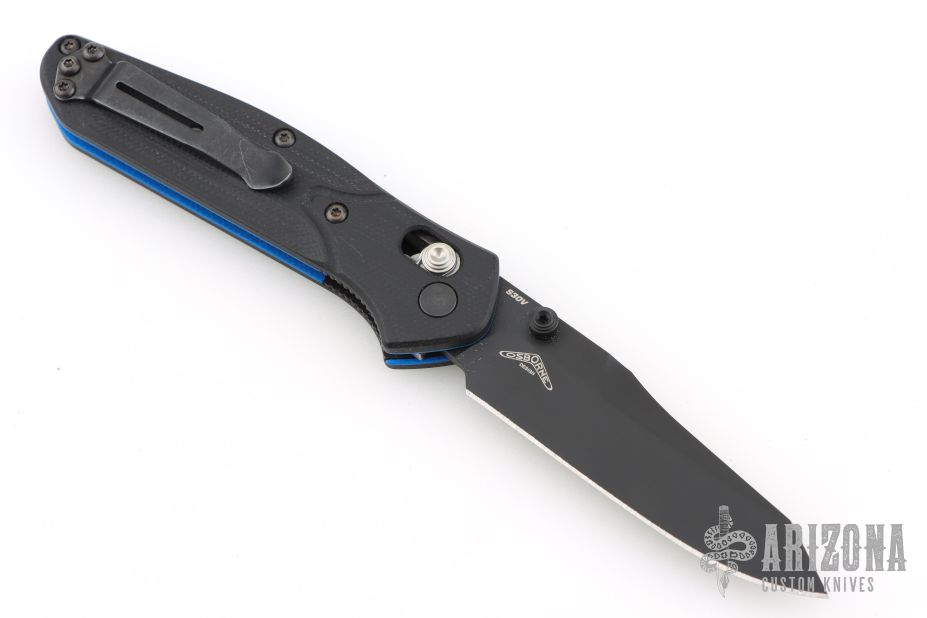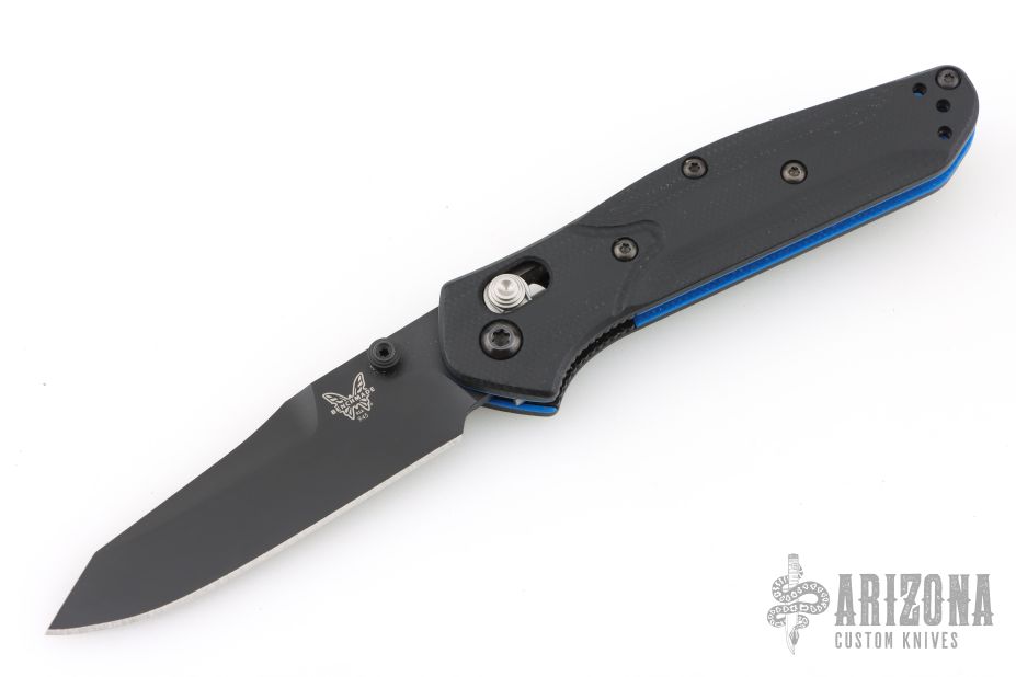 The Benchmade Osborne 945BK-1 is the same beloved Osborne design that has made the 940 a titan of the industry, but it's been shrunk down to a more comfortable size for everyday carry. The knife is made of CPM-S30V steel just like its big brother, and has a black G-10 handle with a blue layer near the center, and black stainless steel liners. It locks open with the proven, ambidextrous AXIS lock, and includes a mini split arrow pocket clip.