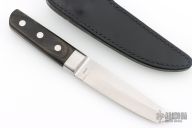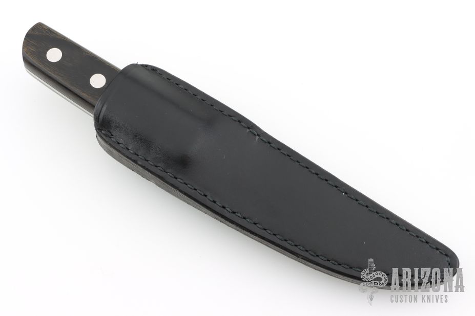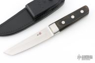This is a vintage Al Mar Model 4003 has laminated wood scales, integral bolster and full tang construction. Satin finished blade with .118" blade stock and 1.127" blade depth. Comes with original black leather sheath and papers. Has some light scratches, good condition otherwise.