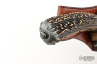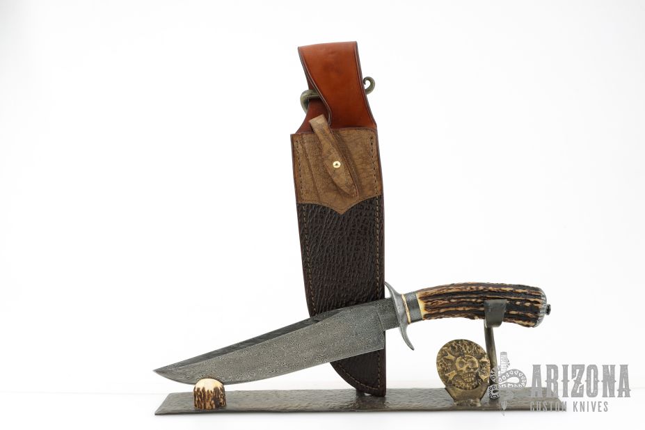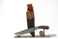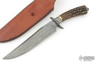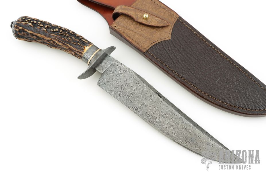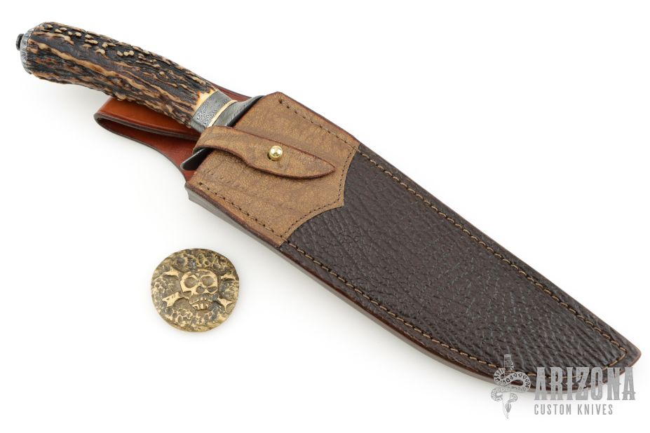 This Bowie by Master Smith David Lisch features a Mosaic Damascus blade with false top edge, .239" blade stock and 1.363" blade depth, hidden tang construction. The handle has a matching Damascus guard, hammered gold spacer with a matching Mosaic Damascus collar, beautiful stag grip with a matching Mosaic Damascus butt and take down screw. Comes with a shark skin and brown leather sheath by Paul Long. Comes with a forged steel and stag display stand. Comes with a custom made brass skull coin that fits in the stand. Excellent condition.