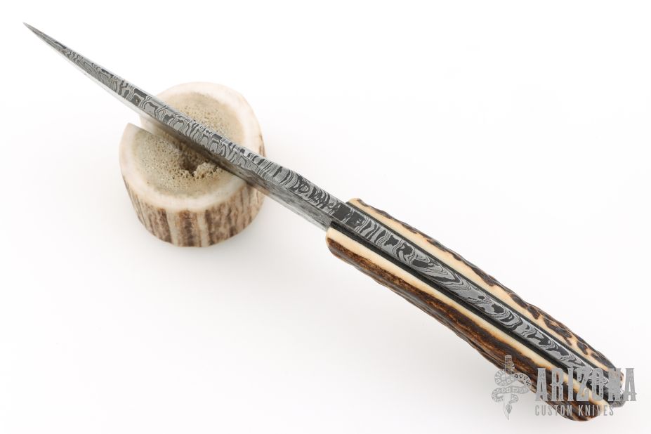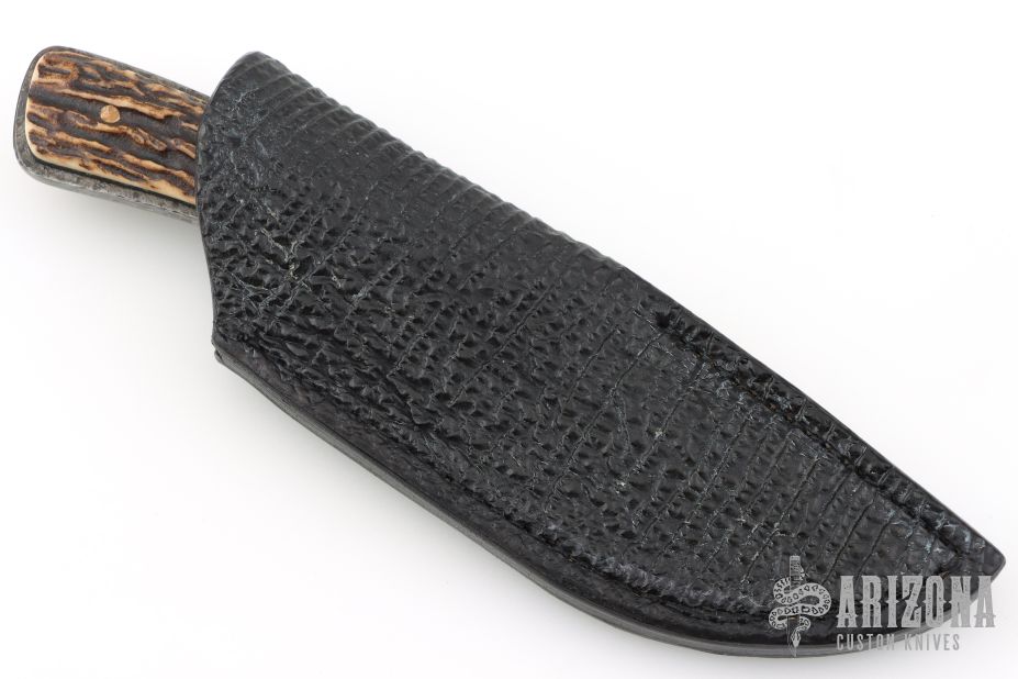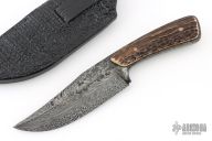 This knife by Master Smith David Lisch features a hand forged Feather Damascus (15n20 and 1080) blade with forge finished flats and false top edge, .259" blade stock and 1.458" blade depth, full tang construction. The handle has Sambar stag scales with black leather liners and bronze pins. Comes with a sharkskin sheath. Excellent condition. Comes with COA.