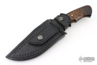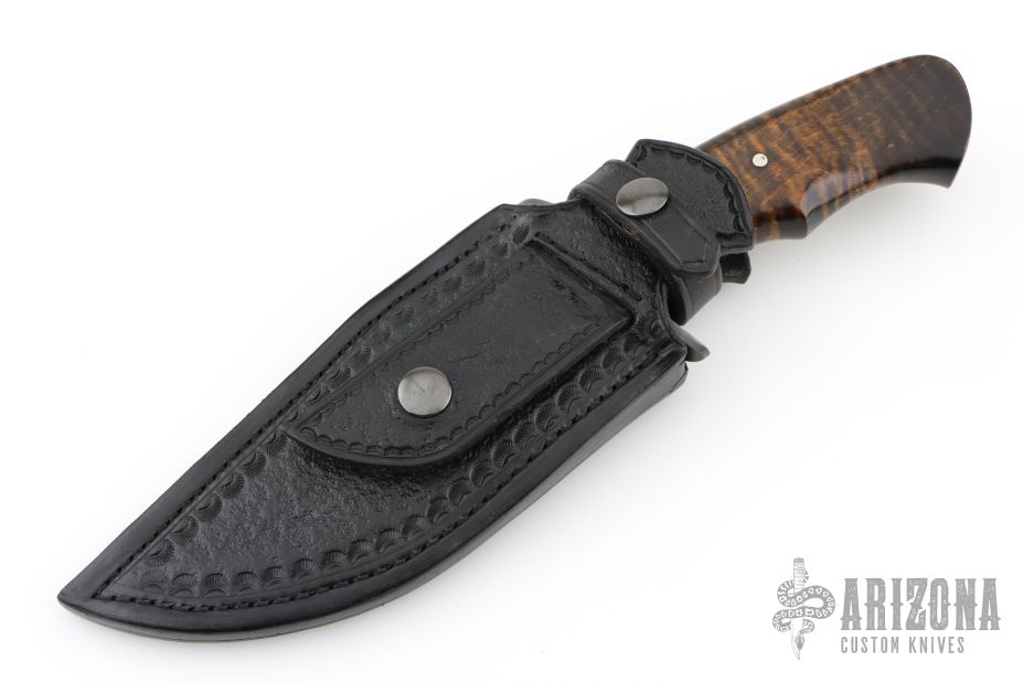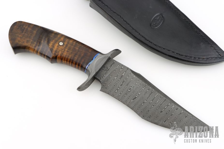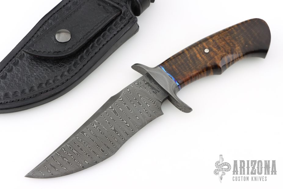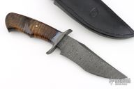 This BodyGuard by Journeyman Smith Ben Seward features a 150 layer Ladder Pattern Damascus (1080/15n20) blade with sharpened top edge, .235" blade stock and 1.750" blade depth, hidden tang construction. The handle has a Damascus guard, tiger maple grip with single nickel silver pin and a fileworked blued steel spacer. Comes with a hand tooled black leather sheath by David Seward. Excellent condition.