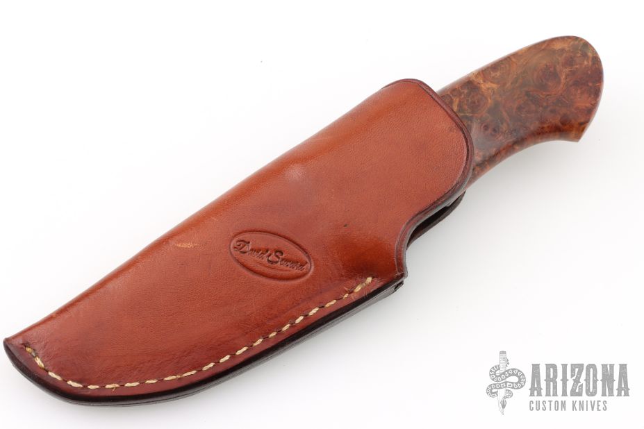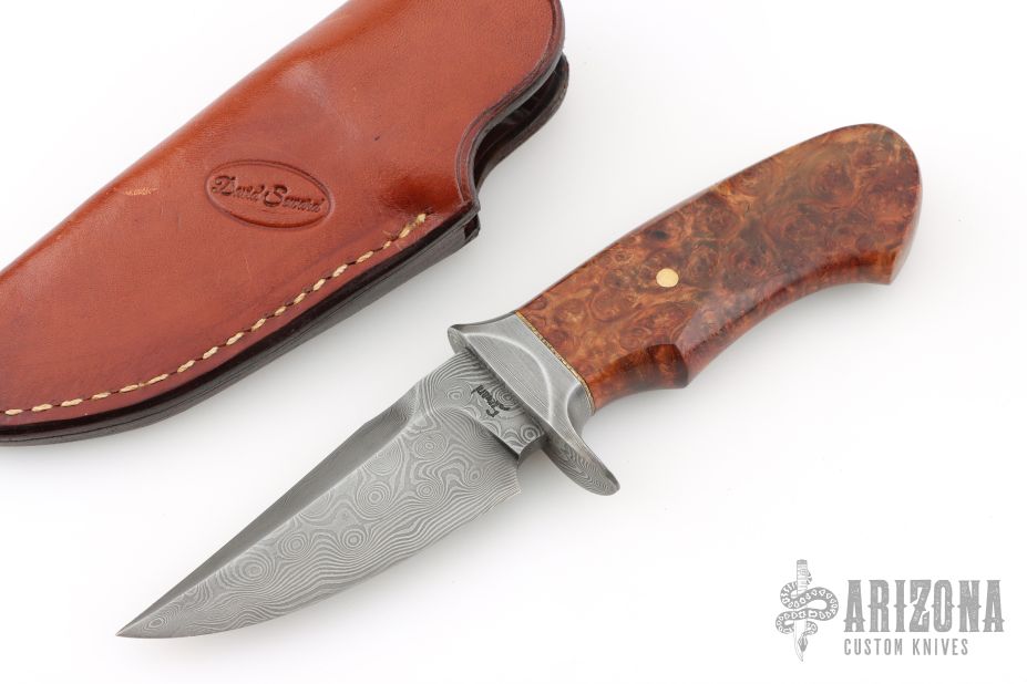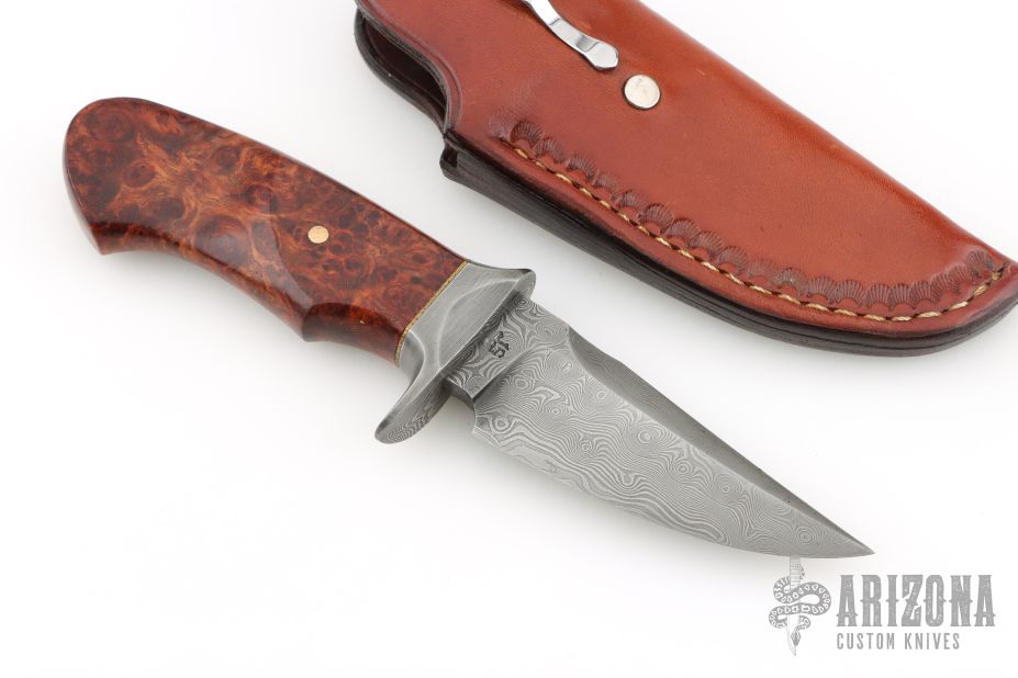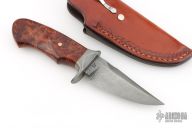 This Vindicator by Journeyman Smith Ben Seward features a Raindrop Damascus (1080/15n20) blade with sharpened top edge, .239" blade stock and 1.234" blade depth, hidden tang construction. The handle has a Damascus guard, Amboyna burl wood grip with single bronze pin and a textured bronze spacer. Comes with a hand tooled brown leather sheath by David Seward. Excellent condition.