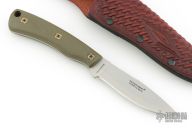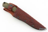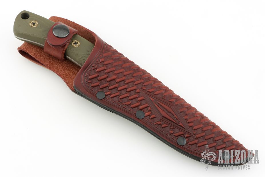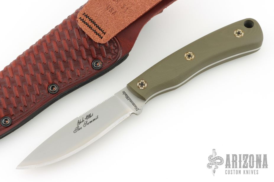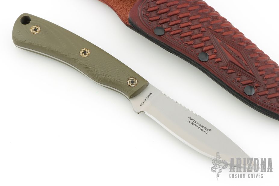 This knife by Diamond Blade features a friction forged D2 blade with notched thumbrest, .119" blade stock and .929" blade depth, full tang construction. The handle has g10 scales with mosaic pins and a lanyard hole. Comes with a tooled brown leather sheath and a box. Excellent condition.