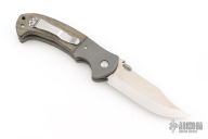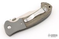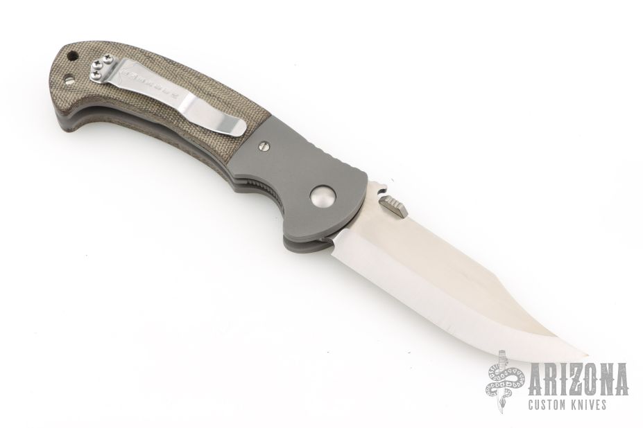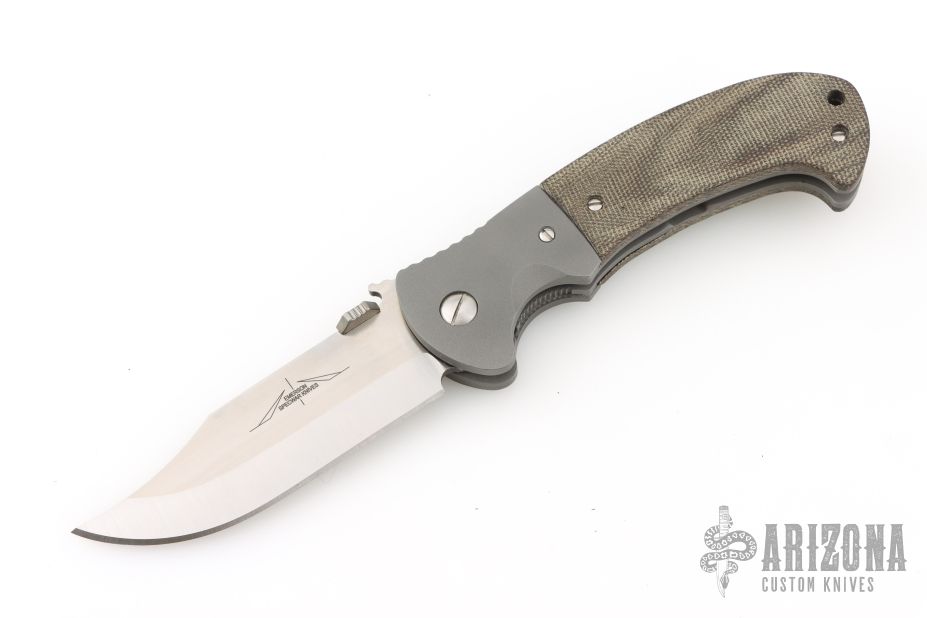This custom CQC-13 by Emerson Knives features a hand-ground satin finish blade with notched thumbrest, thumbdisc and wave feature. The handle has bead blasted and dovetailed titanium bolsters and liners, green canvas micarta scales, black G-10 backspacer, stainless steel clip, tip up carry. Comes with original box and papers. Includes an upgraded thumbstud and the original.  Excellent Condition.