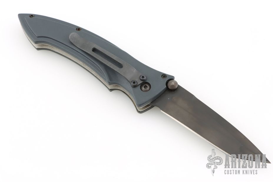This LTT-875 by Masters of Defense features a black plain tanto blade with false top edge, and dual thumbstuds. The handle is gray polymer with a tip down black stainless clip, safety on the spine and push button. Includes original box. Has a couple light scuffs and scratches, otherwise Excellent condition.