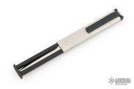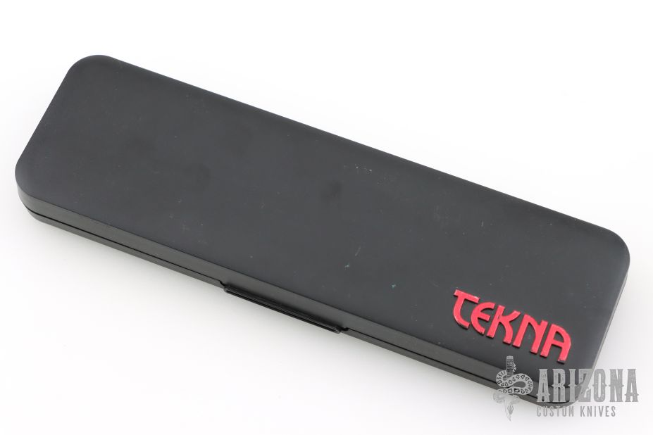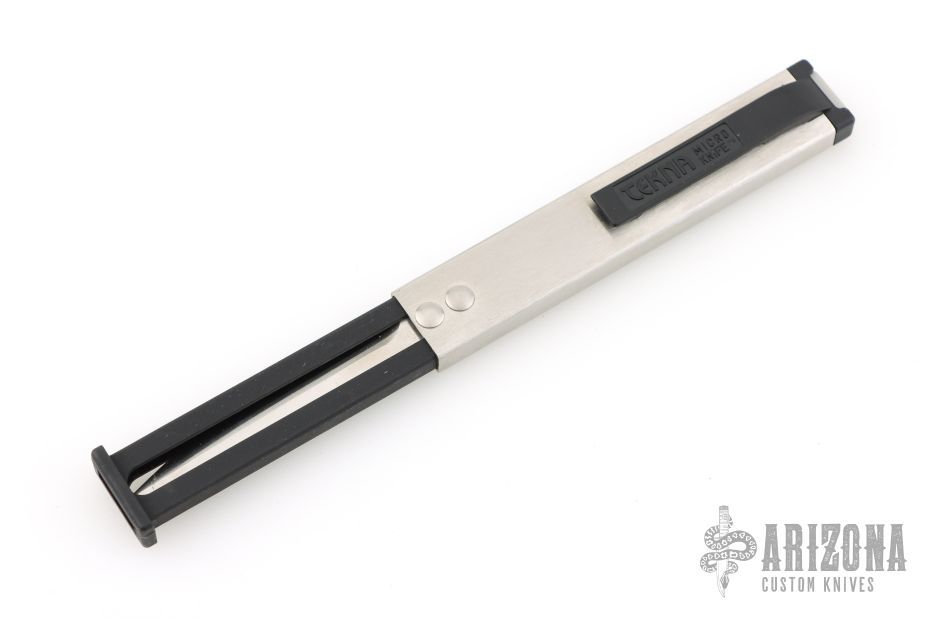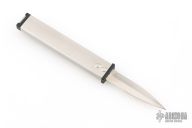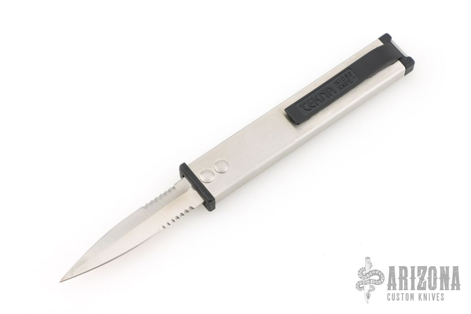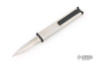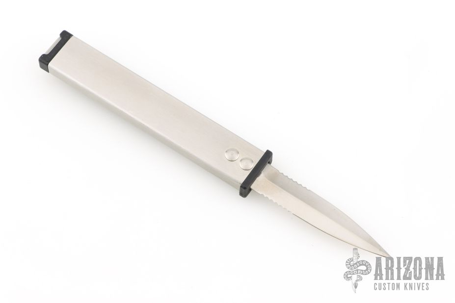 Unusual automatic where the blade is fixed and the release button retracts the guard. Satin finished partially serrated blade. Comes with original box. Excellent condition.