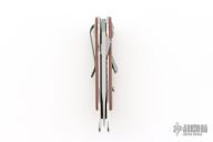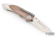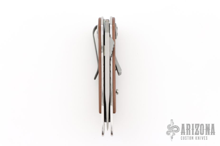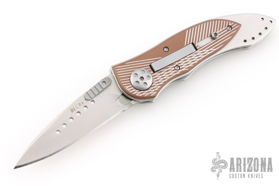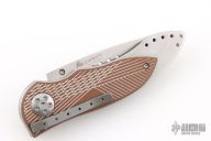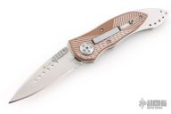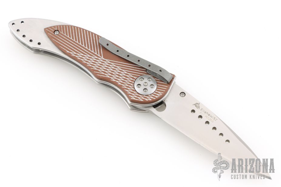 This Elishewitz designed 7323 E-Lock Bronze button lock folder has a satin finished AUS-8 stainless steel drop/spear point blade with plain edge and a unique terraced single thumb stud. Handle is bronze anodized/ milled aluminum scales over satin finished stainless steel frame, bead blasted grey tip down stainless steel clip, and black fiber back spacer. Comes with original box. Has some light scuffs and scratches, excellent condition otherwise.